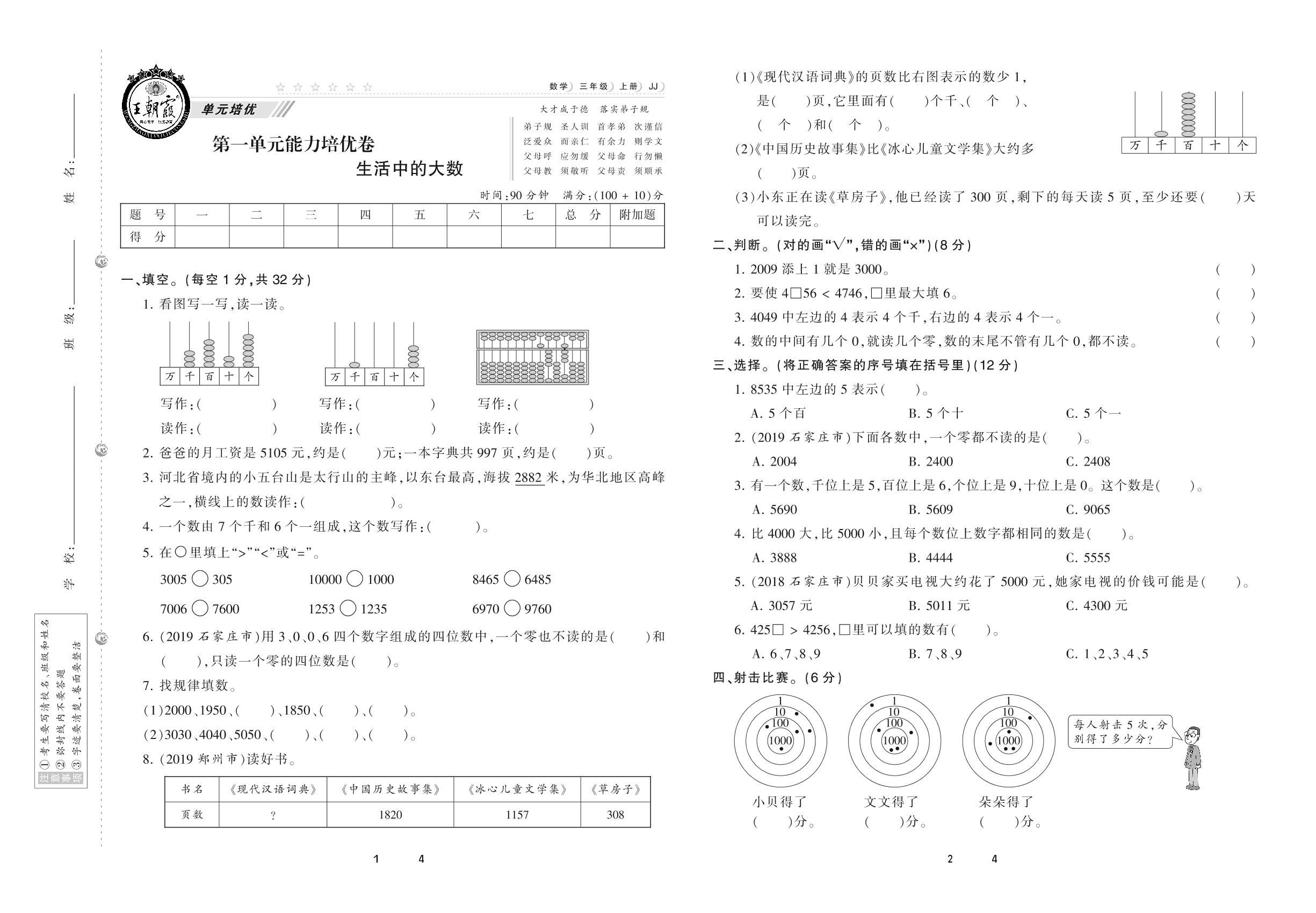 2020上册三年级数学冀教版 第一单元 能力培优卷