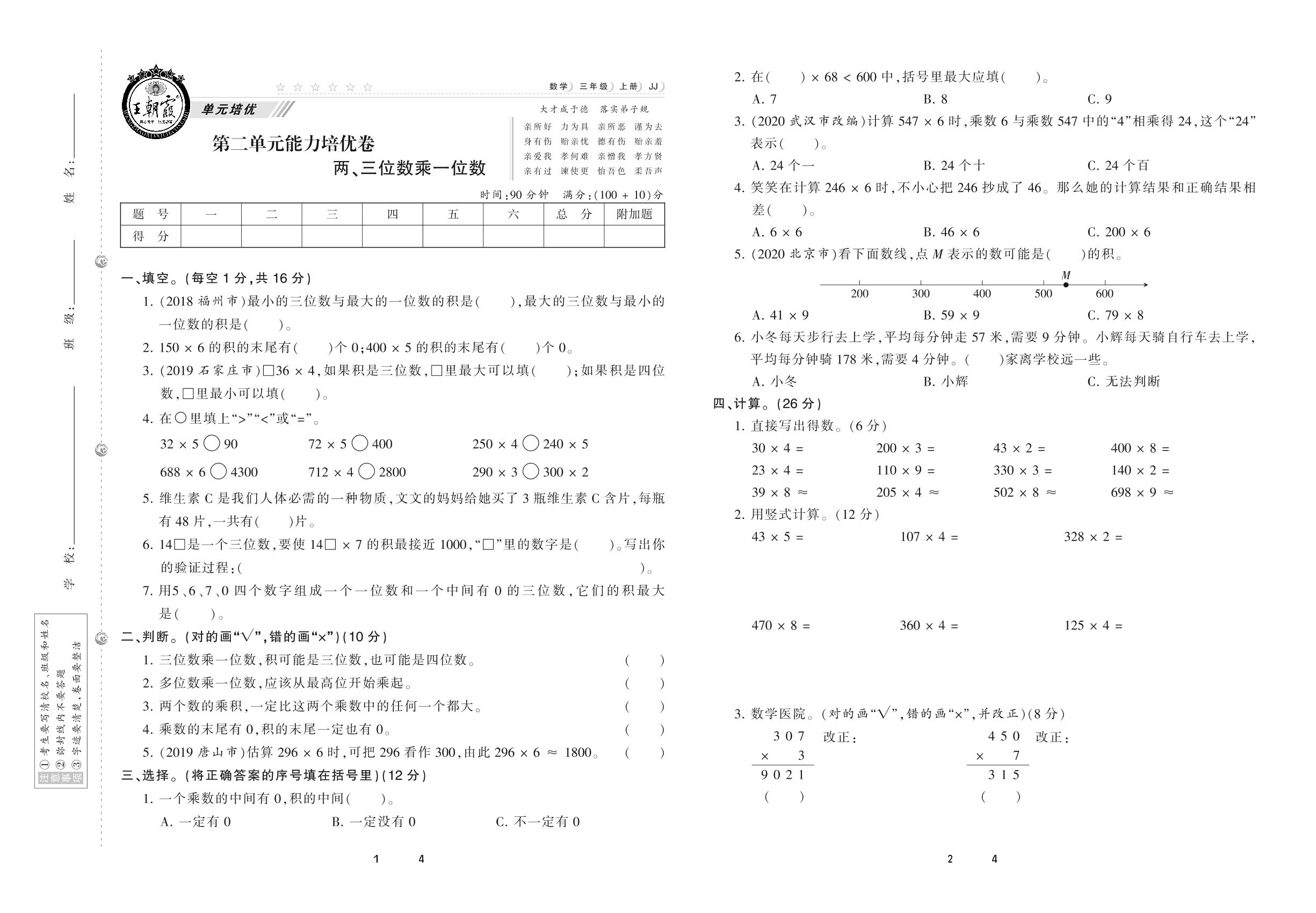 2020上册三年级数学冀教版 第二单元 能力培优卷