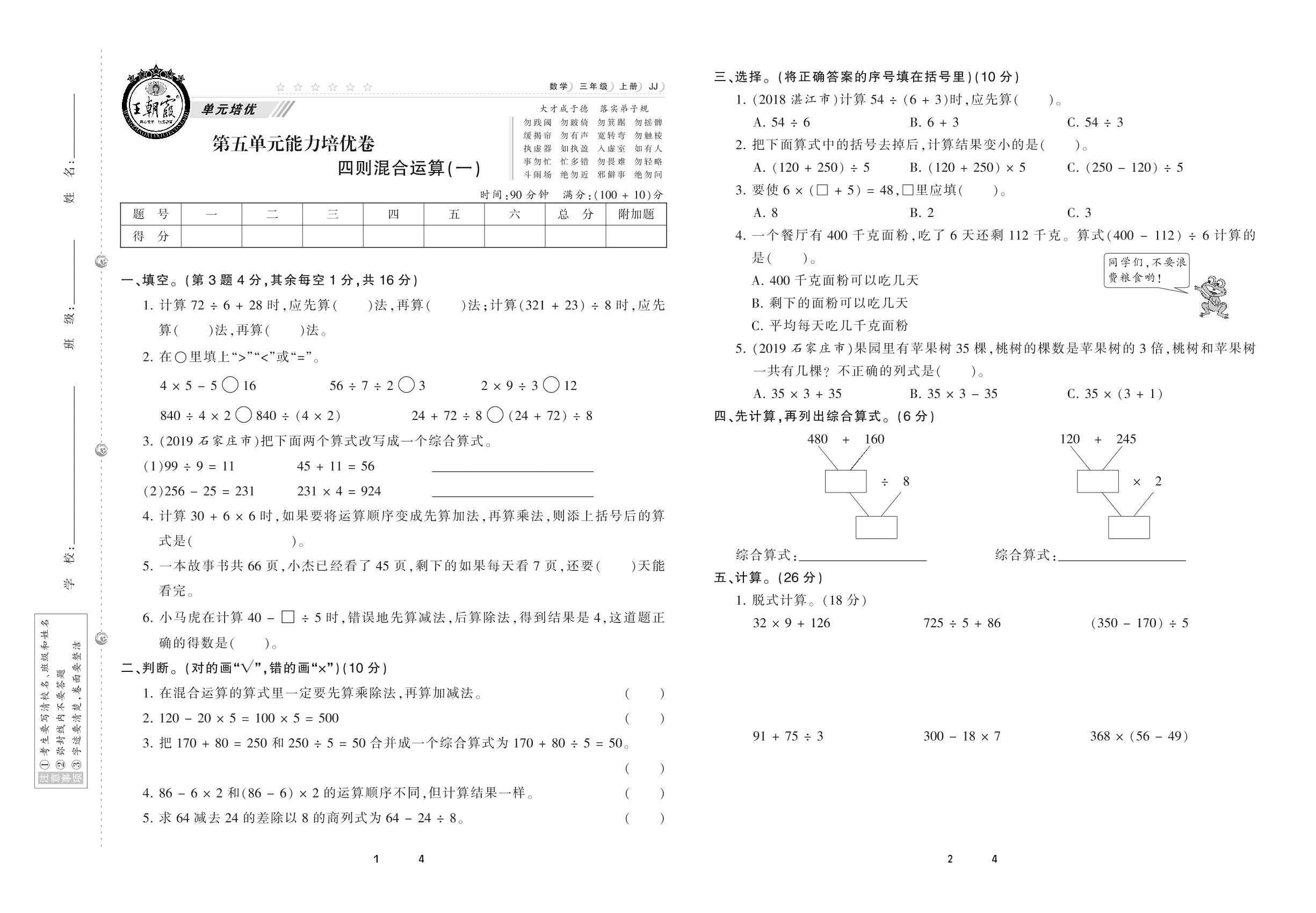 2020上册三年级数学冀教版 第五单元 能力培优卷