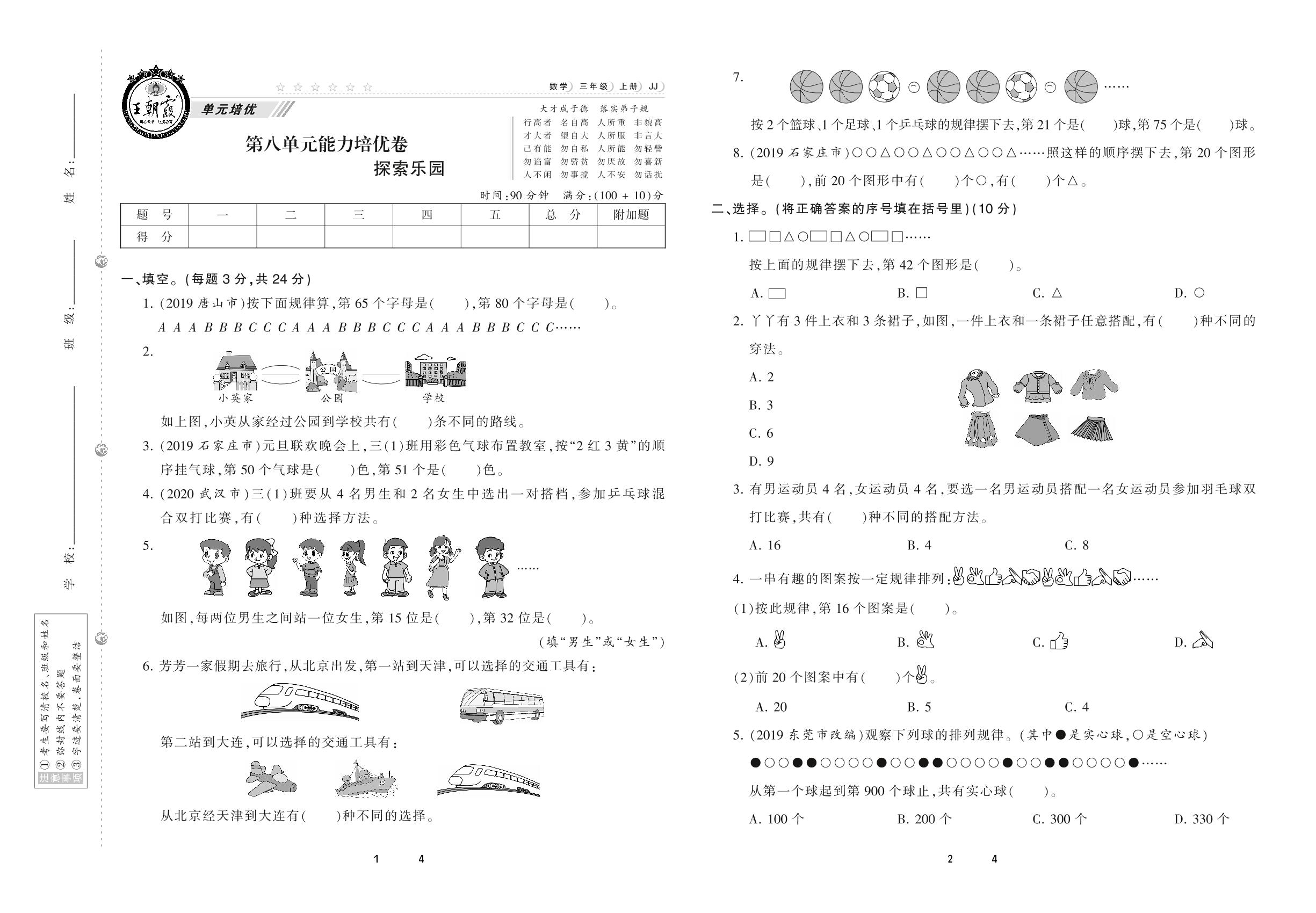 2020上册三年级数学冀教版 第八单元 能力培优卷