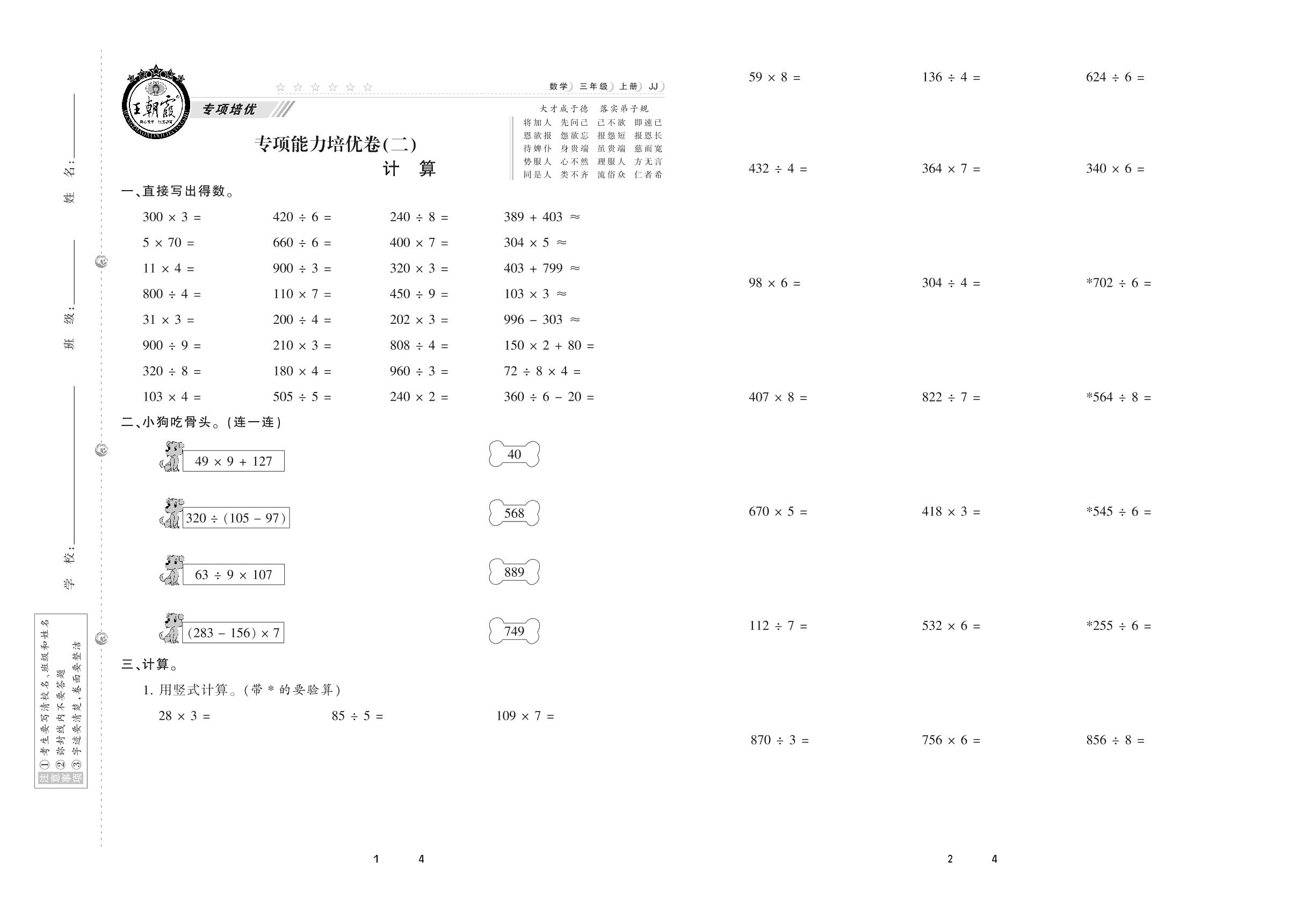 2020上册三年级数学冀教版 专项能力培优卷(二) 计算