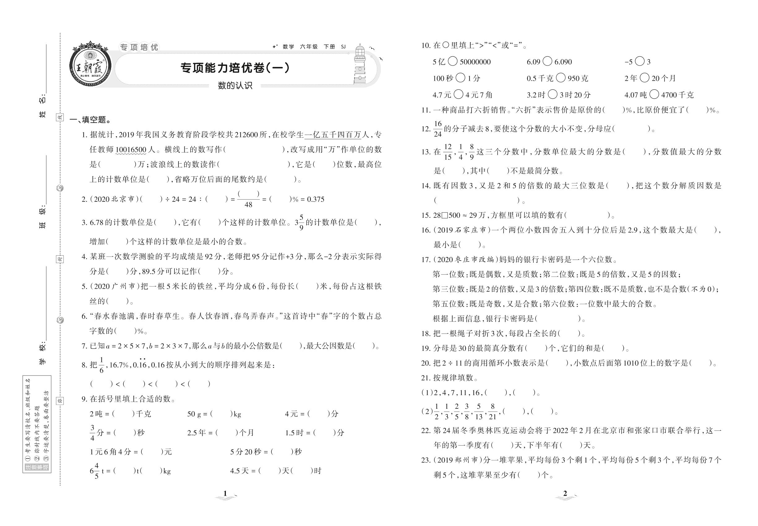 2021下册六年级数学苏教版 专项能力培优卷(一) 数的认识