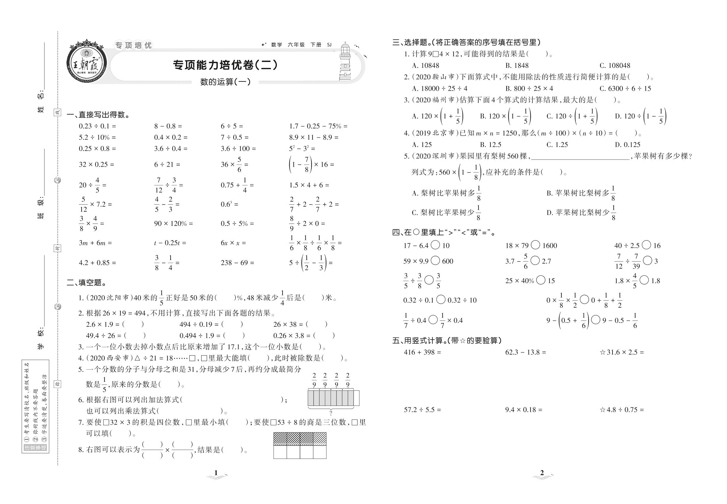 2021下册六年级数学苏教版 专项能力培优卷(二) 数的运算(一)