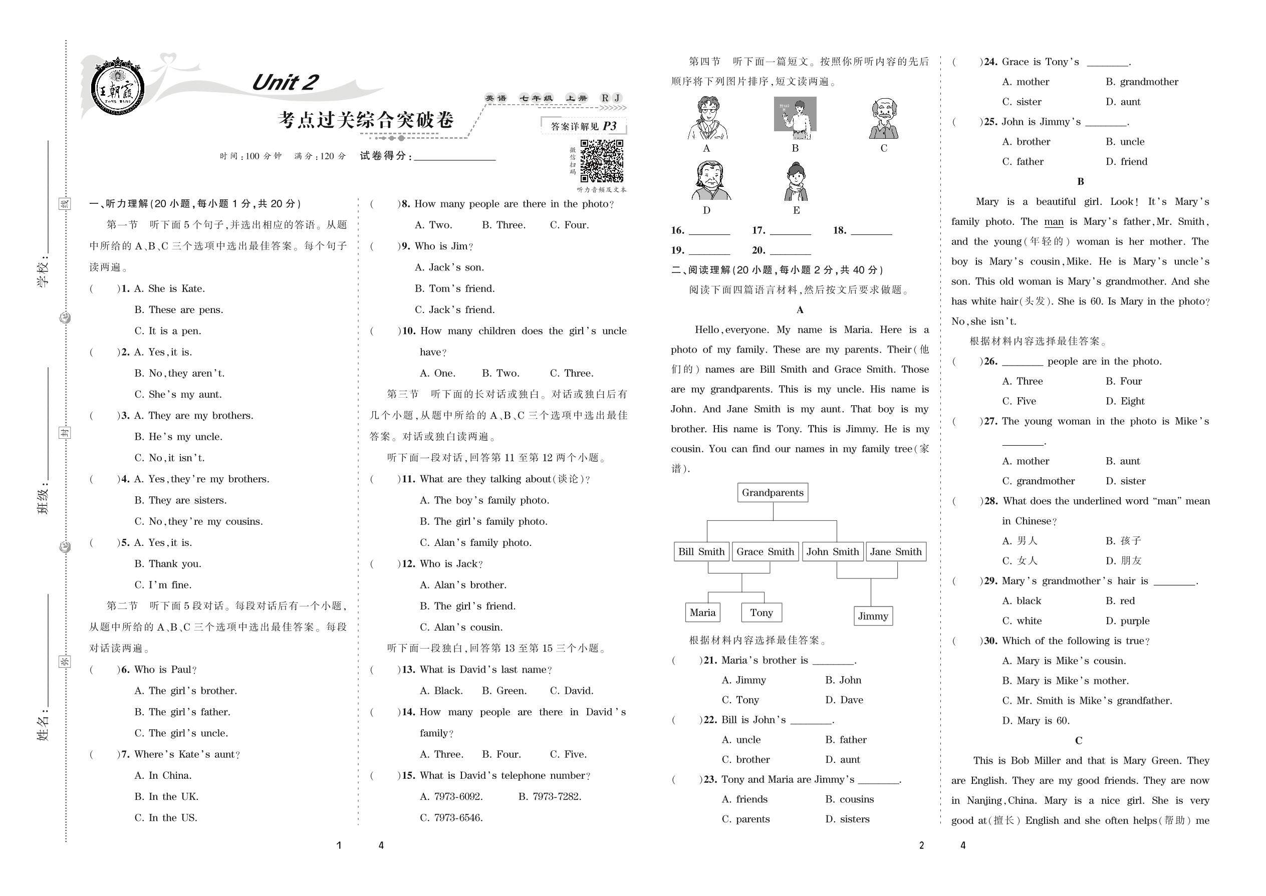 2020上册七年级英语人教版 Unit 2 考点过关综合突破卷