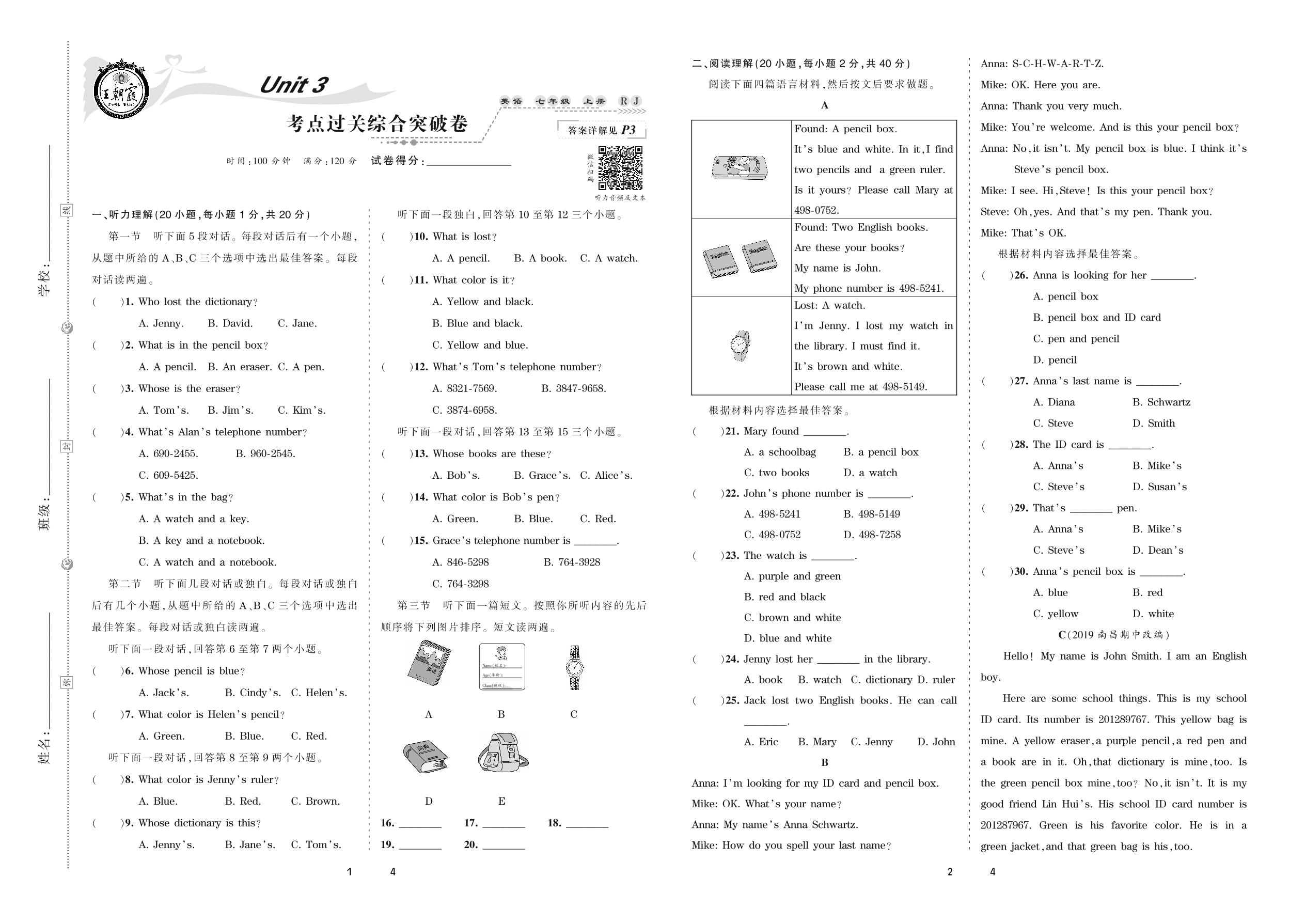 2020上册七年级英语人教版 Unit 3 考点过关综合突破卷