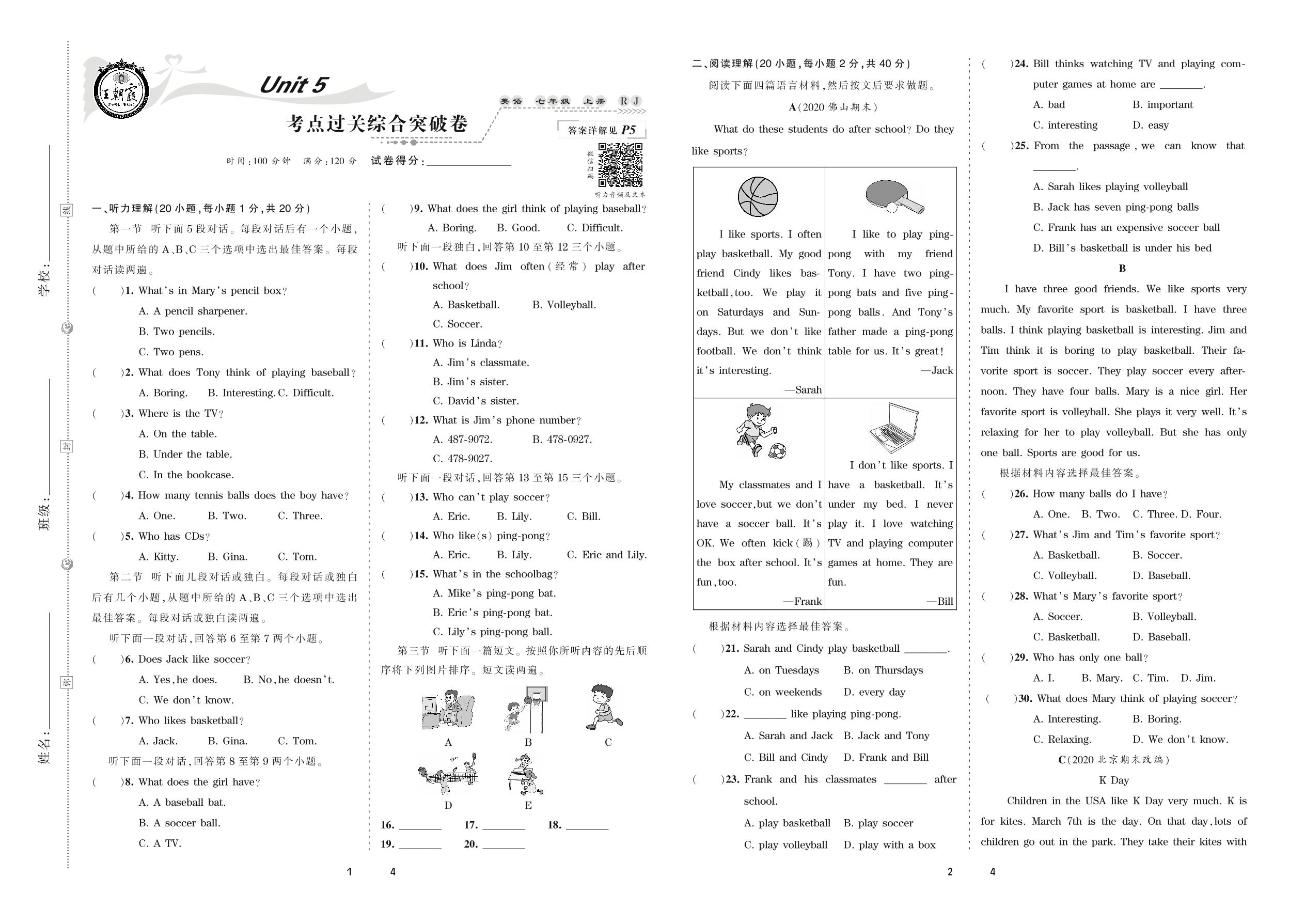 2020上册七年级英语人教版 Unit 5 考点过关综合突破卷