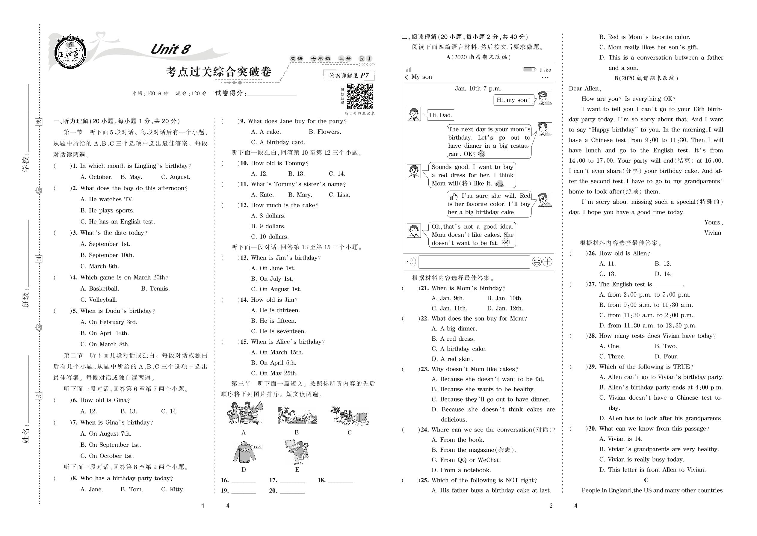 2020上册七年级英语人教版 Unit 8 考点过关综合突破卷