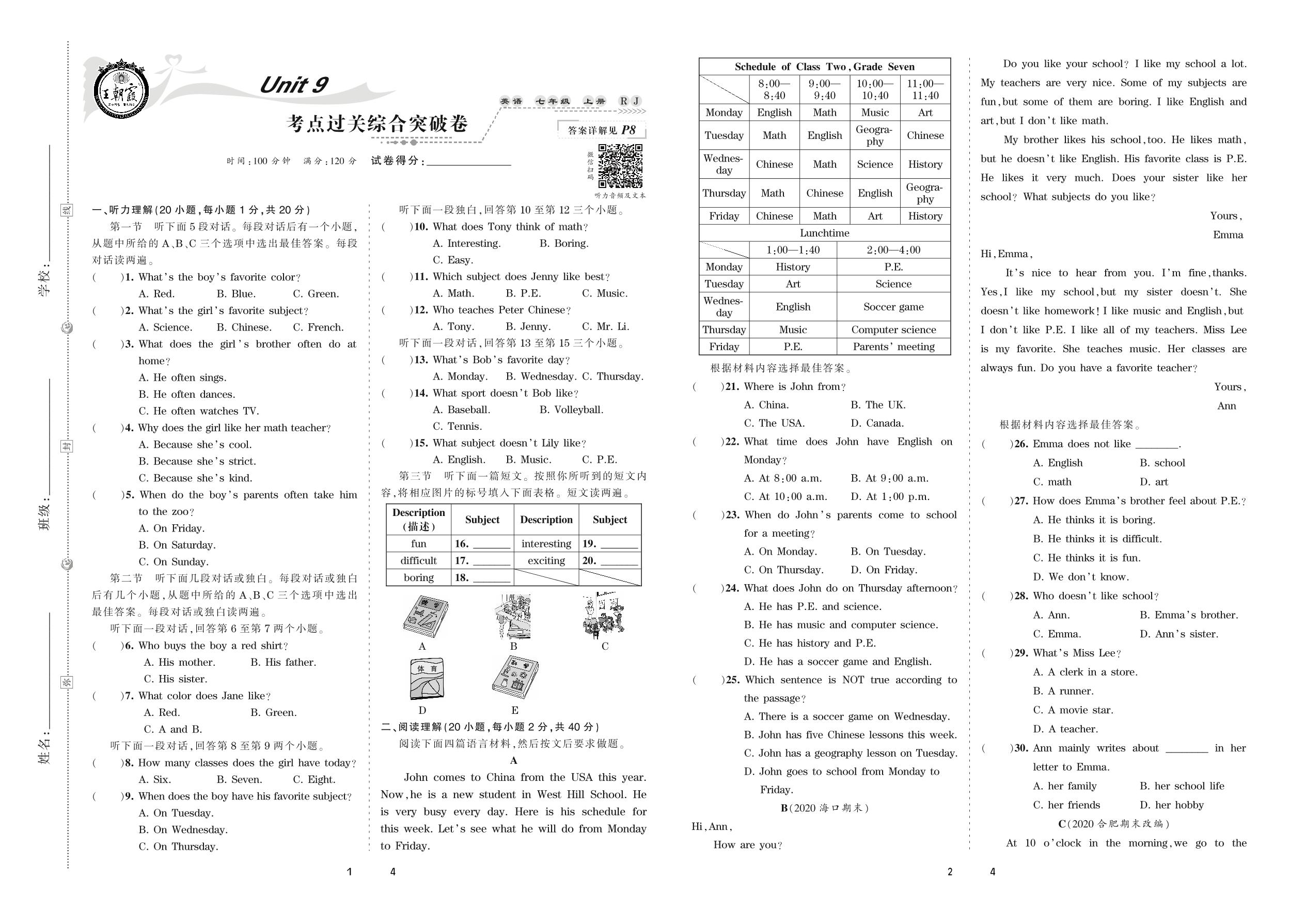 2020上册七年级英语人教版 Unit 9 考点过关综合突破卷