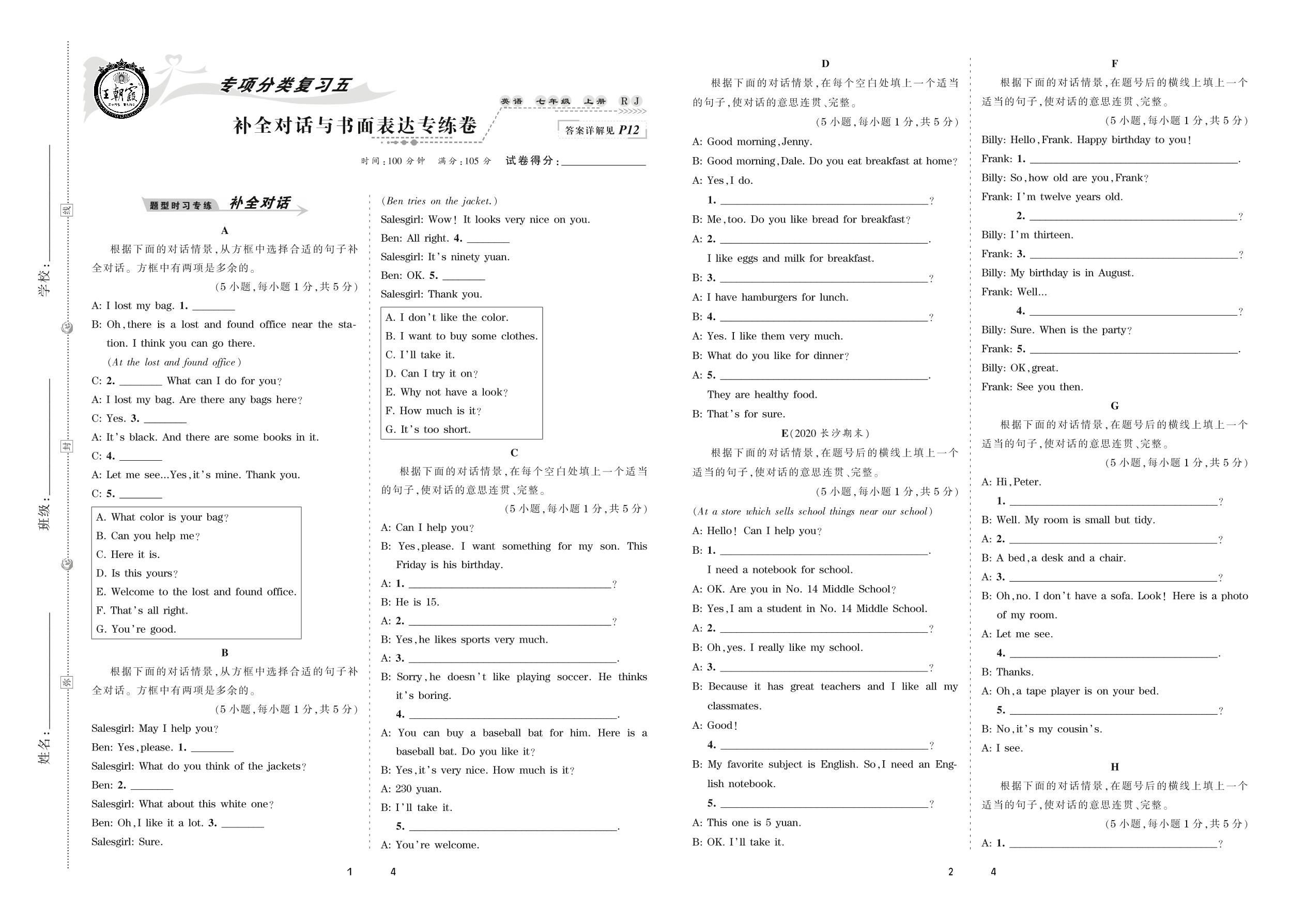 2020上册七年级英语人教版 补全对话与书面表达专练卷