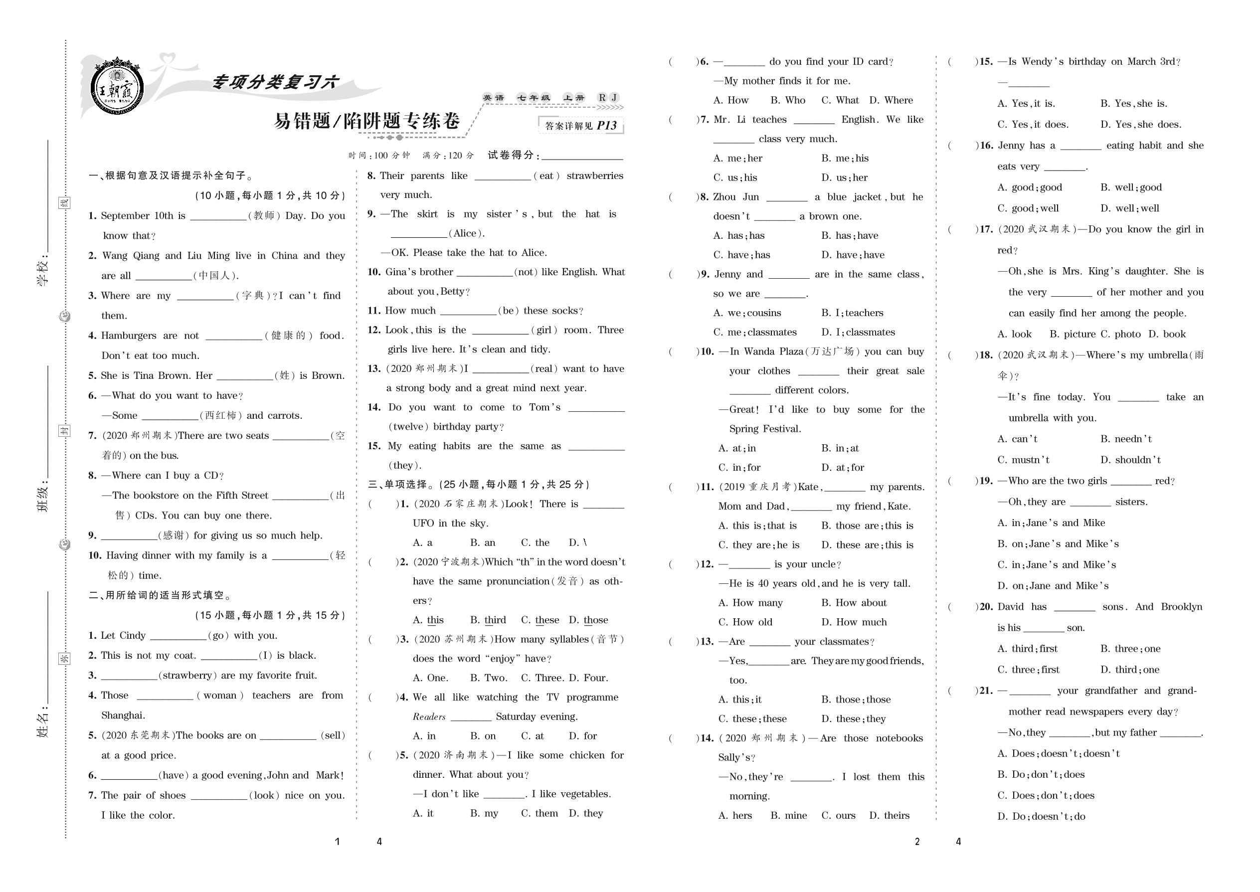 2020上册七年级英语人教版 易错题、陷阱题专练卷