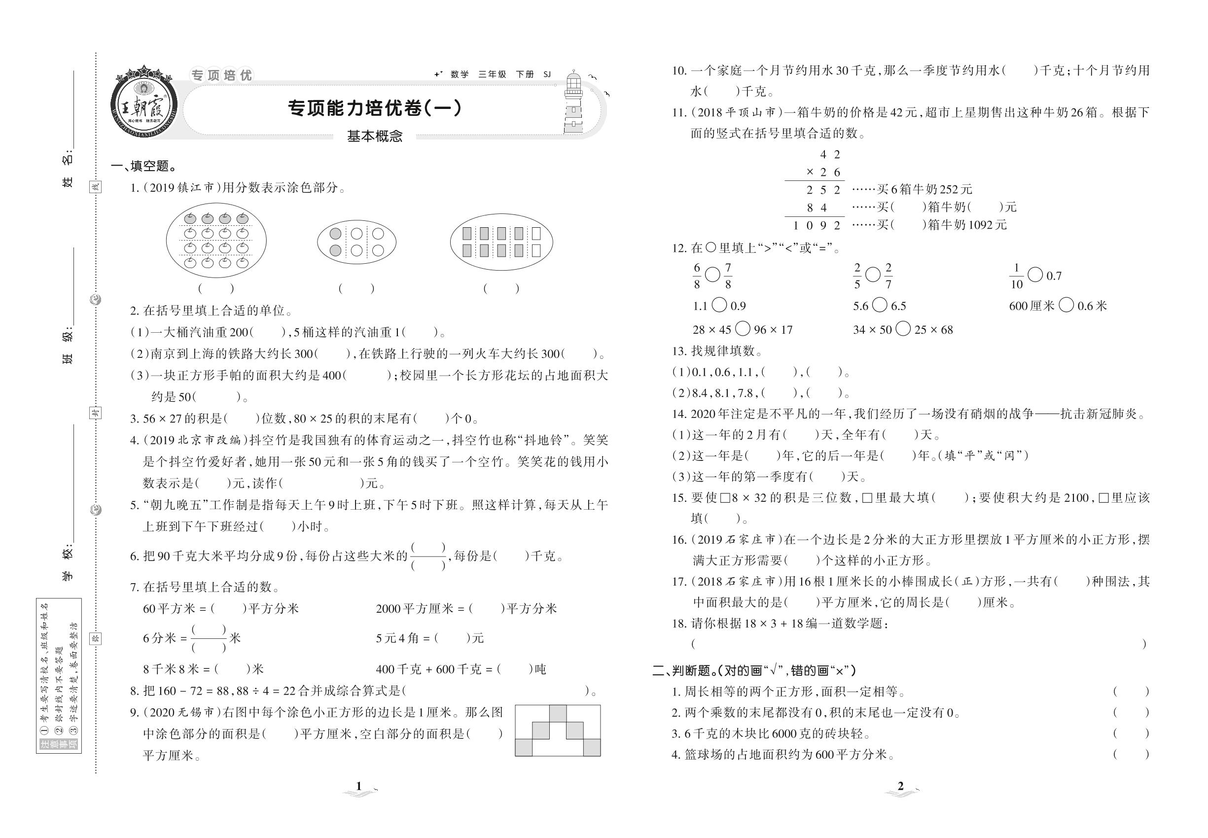 2021下册三年级数学苏教版 专项能力培优卷(一) 基本概念