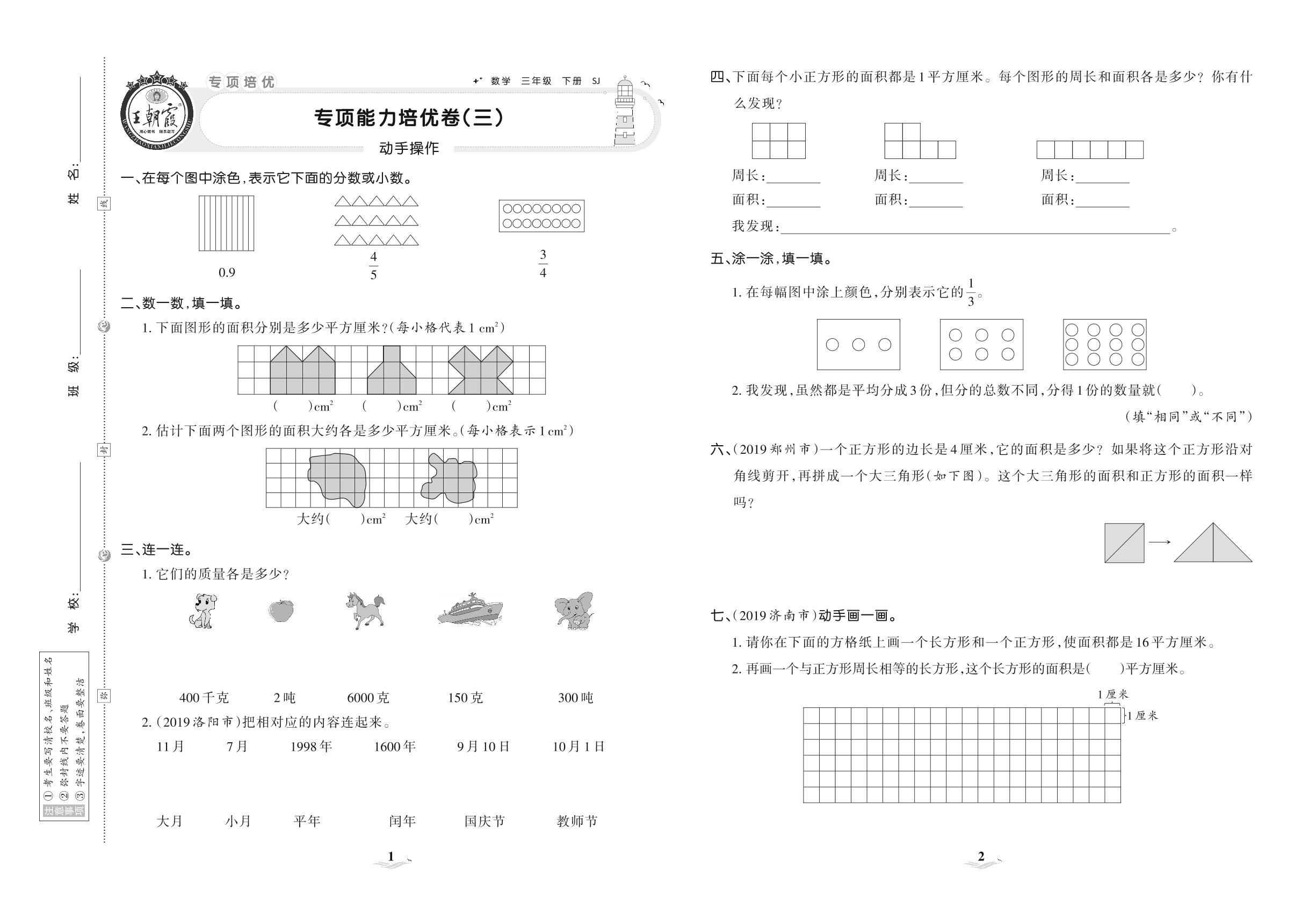 2021下册三年级数学苏教版 专项能力培优卷(三) 动手操作
