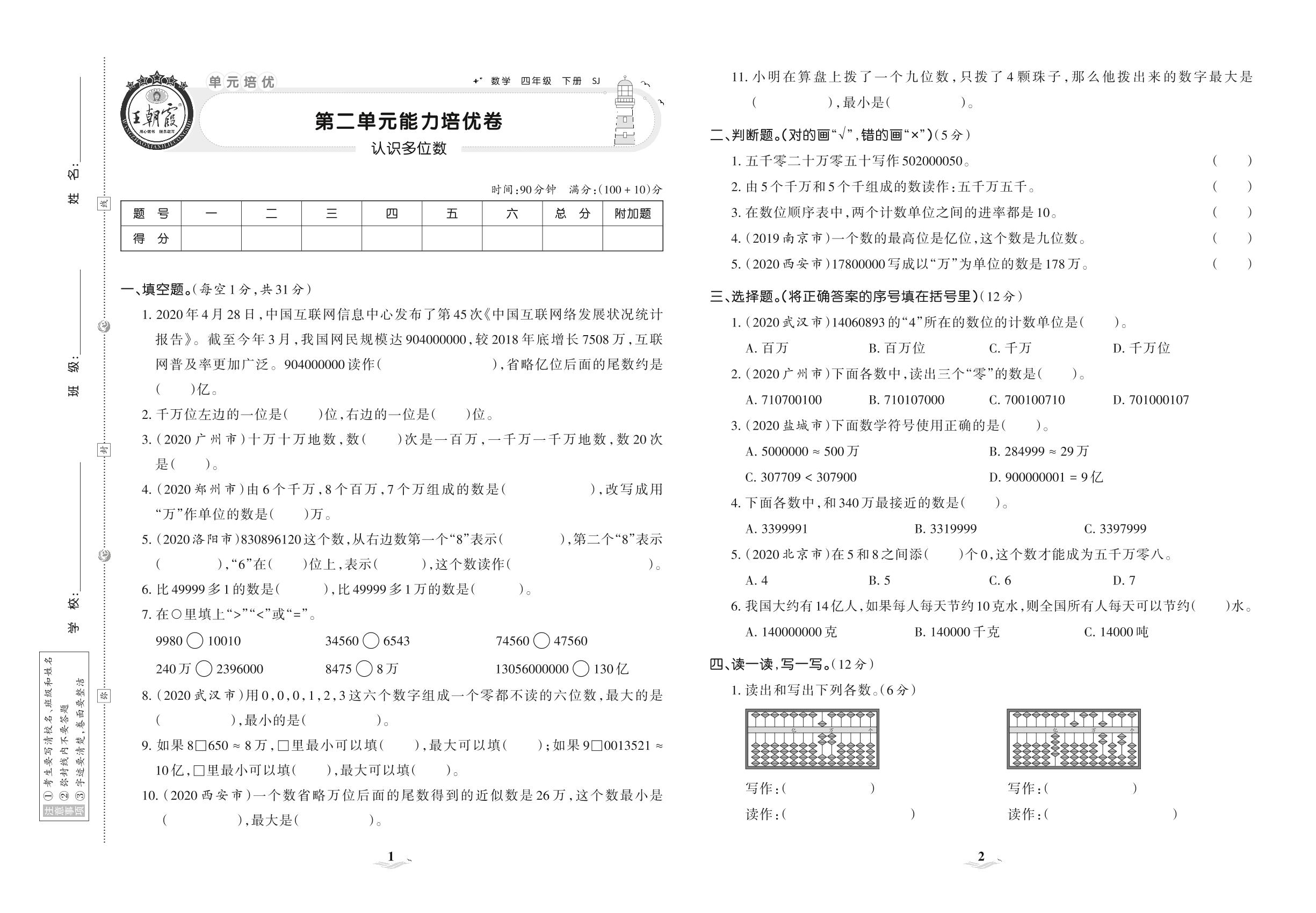 2021下册四年级数学苏教版 第二单元 能力培优卷