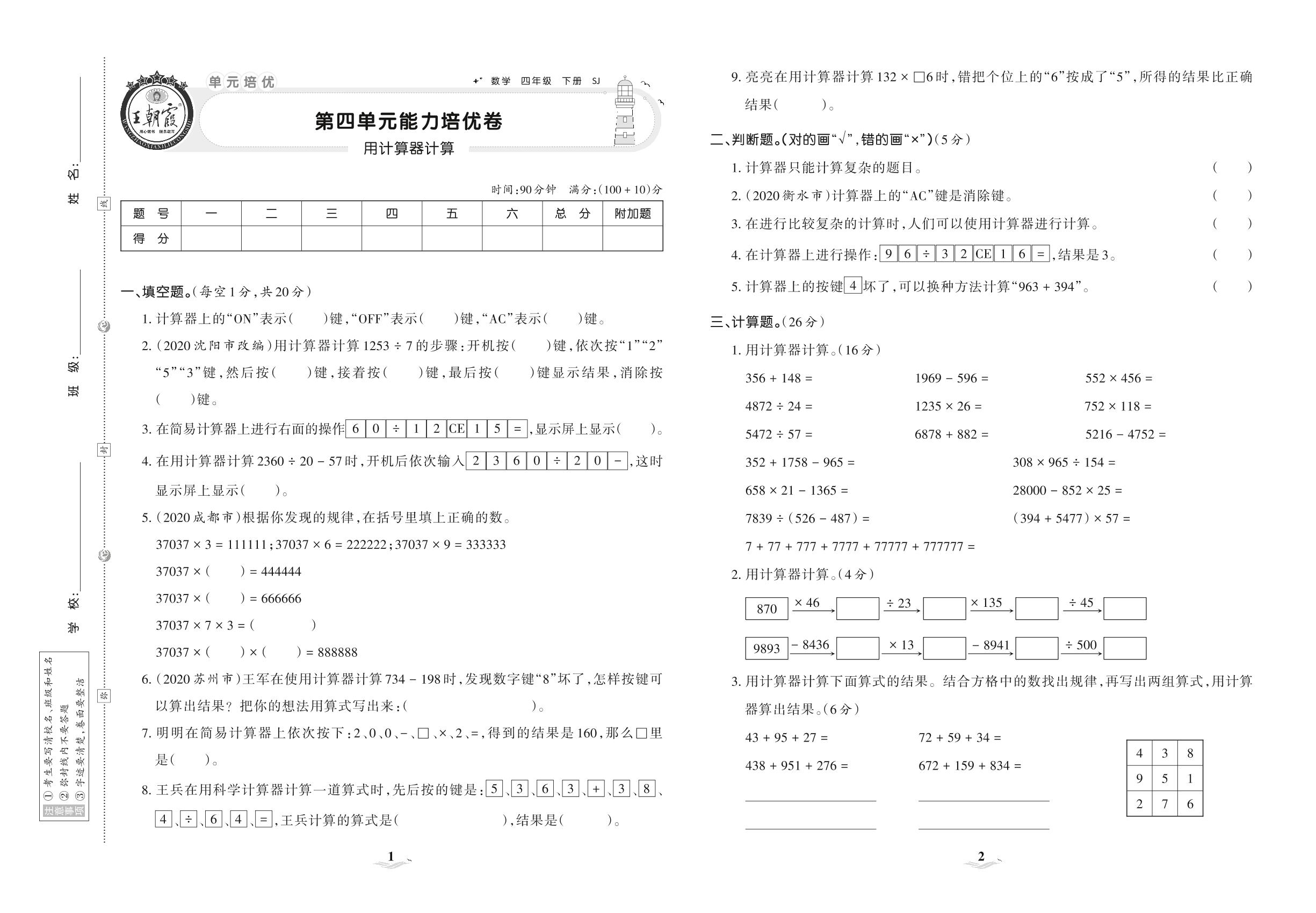 2021下册四年级数学苏教版 第四单元 能力培优卷
