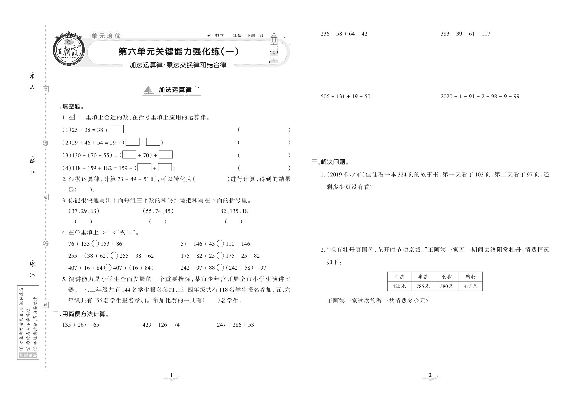 2021下册四年级数学苏教版 第六单元 关键能力强化练(一)