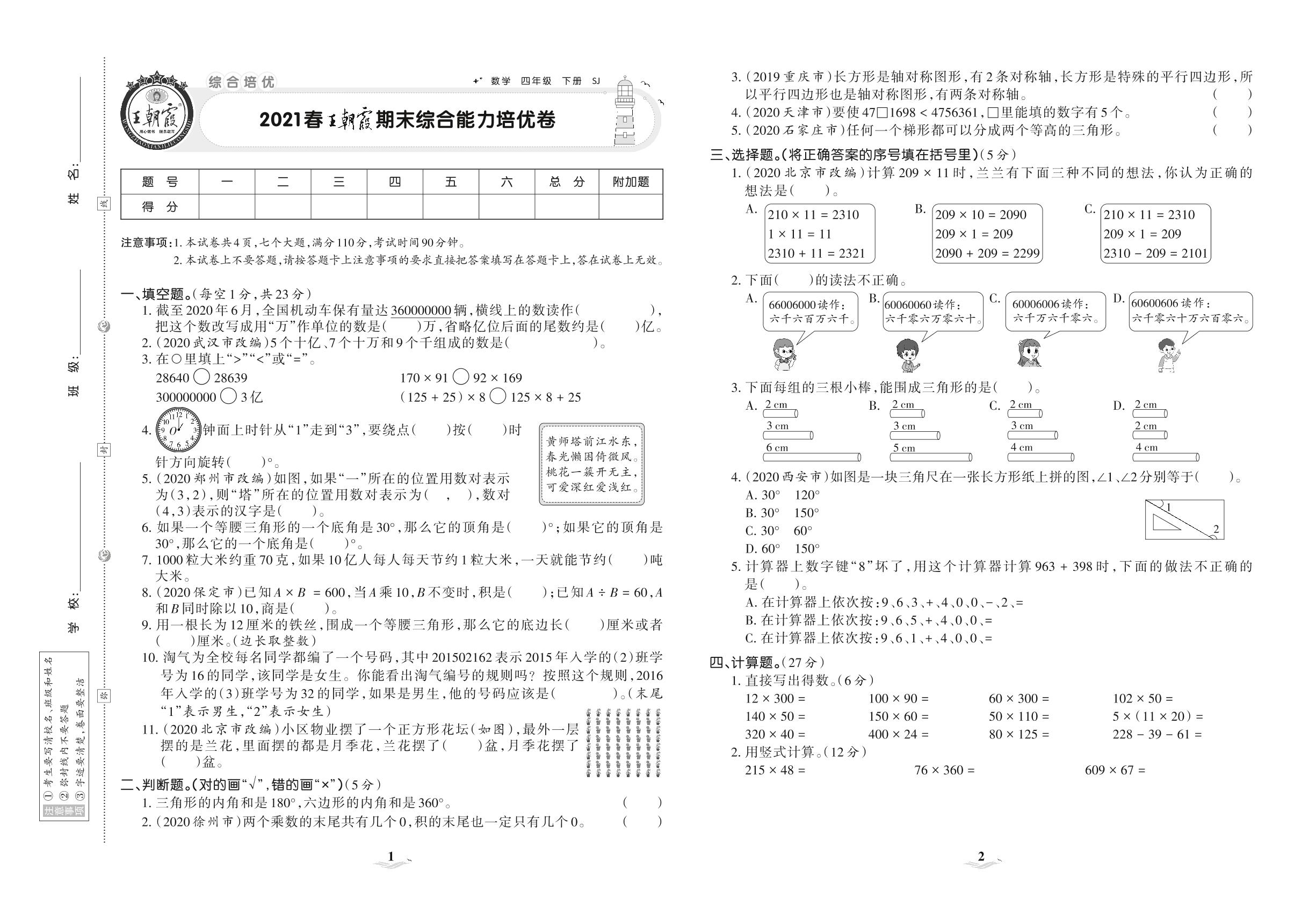2021下册四年级数学苏教版 王朝霞期末综合能力培优卷