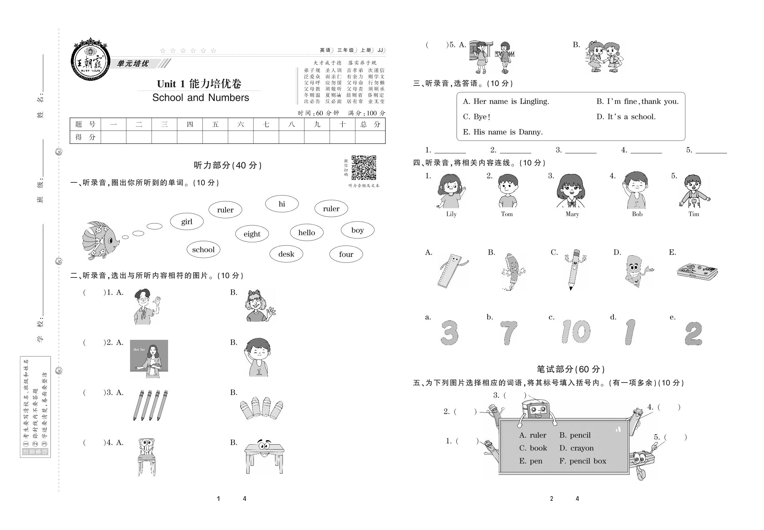 三年级英语冀教版上册单元卷