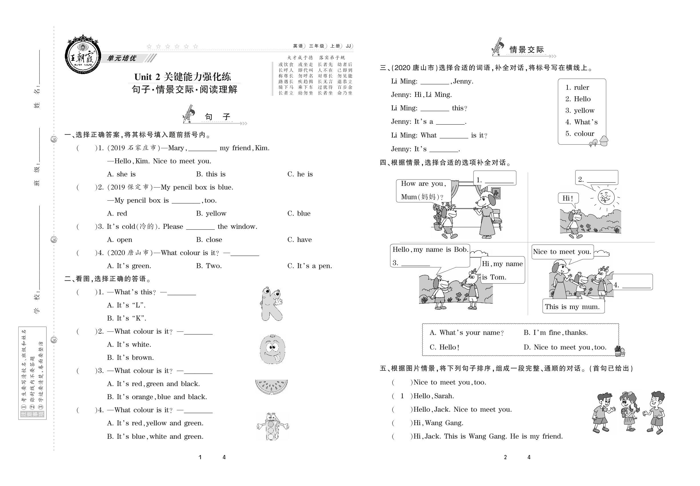 2020上册三年级英语冀教版 Unit 2 关键能力强化练