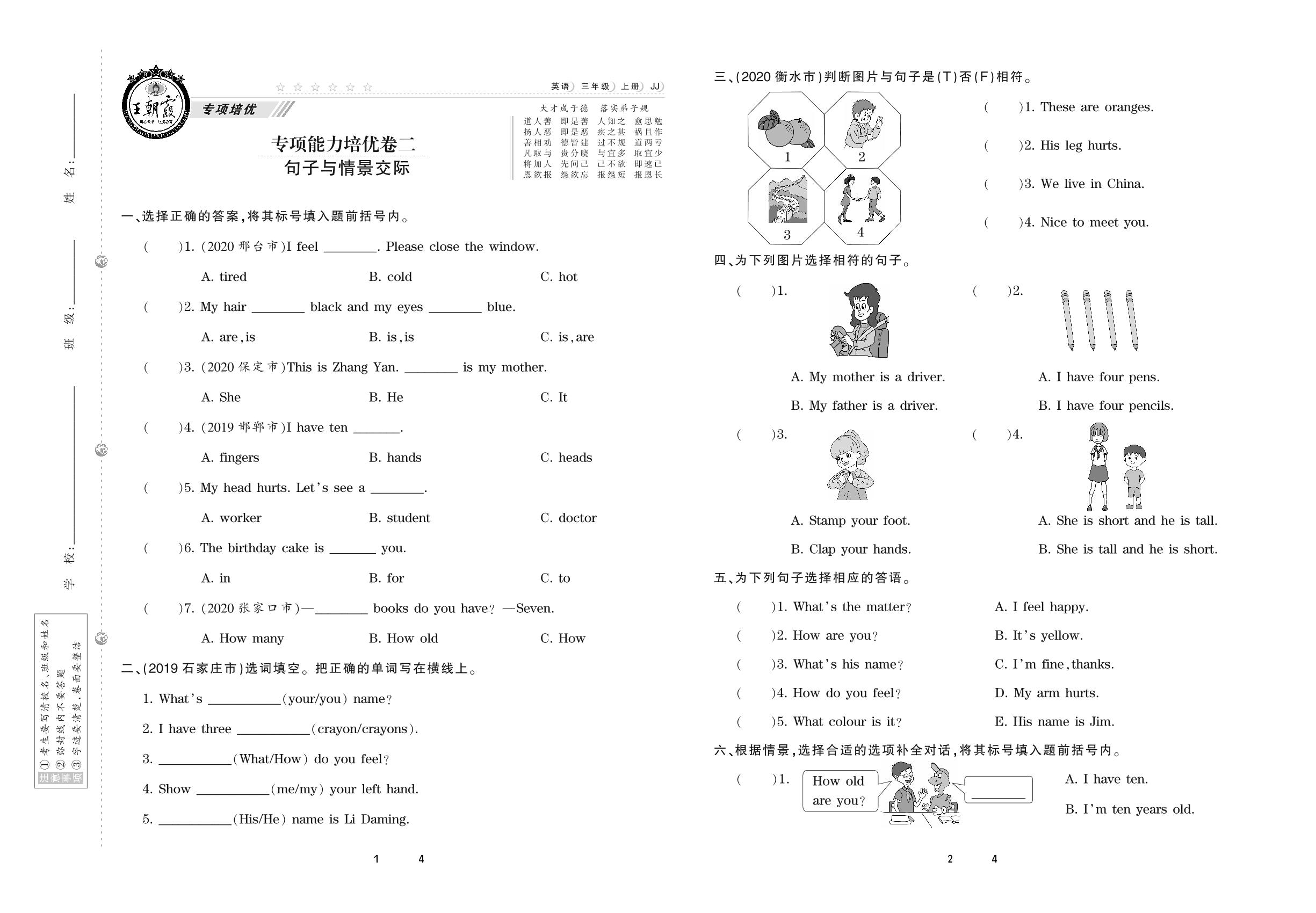 2020上册三年级英语冀教版 专项能力培优卷二 句子与情景交际