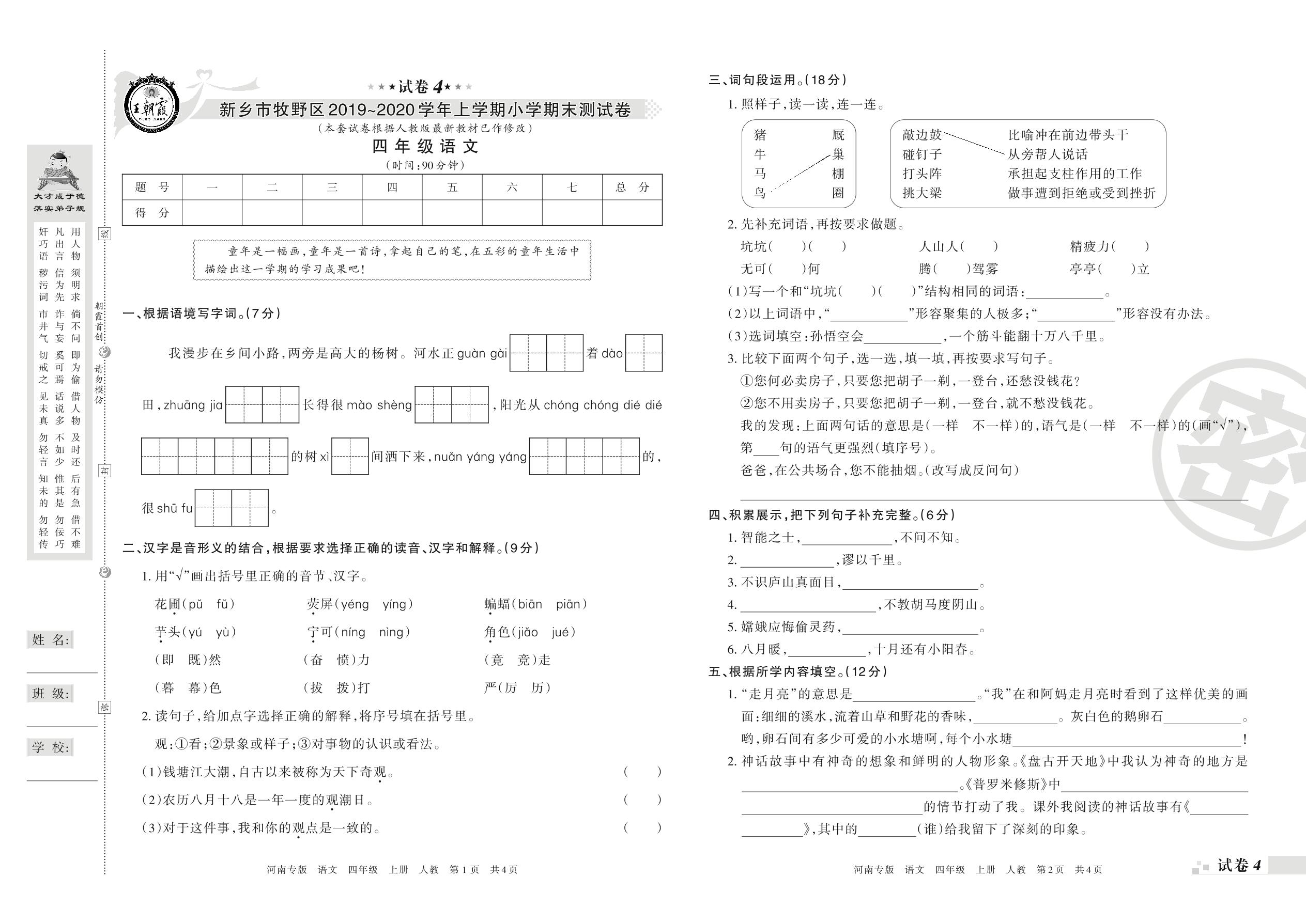2019-2020学年第一学期新乡市牧野区四年级语文试卷(人教版)【4】