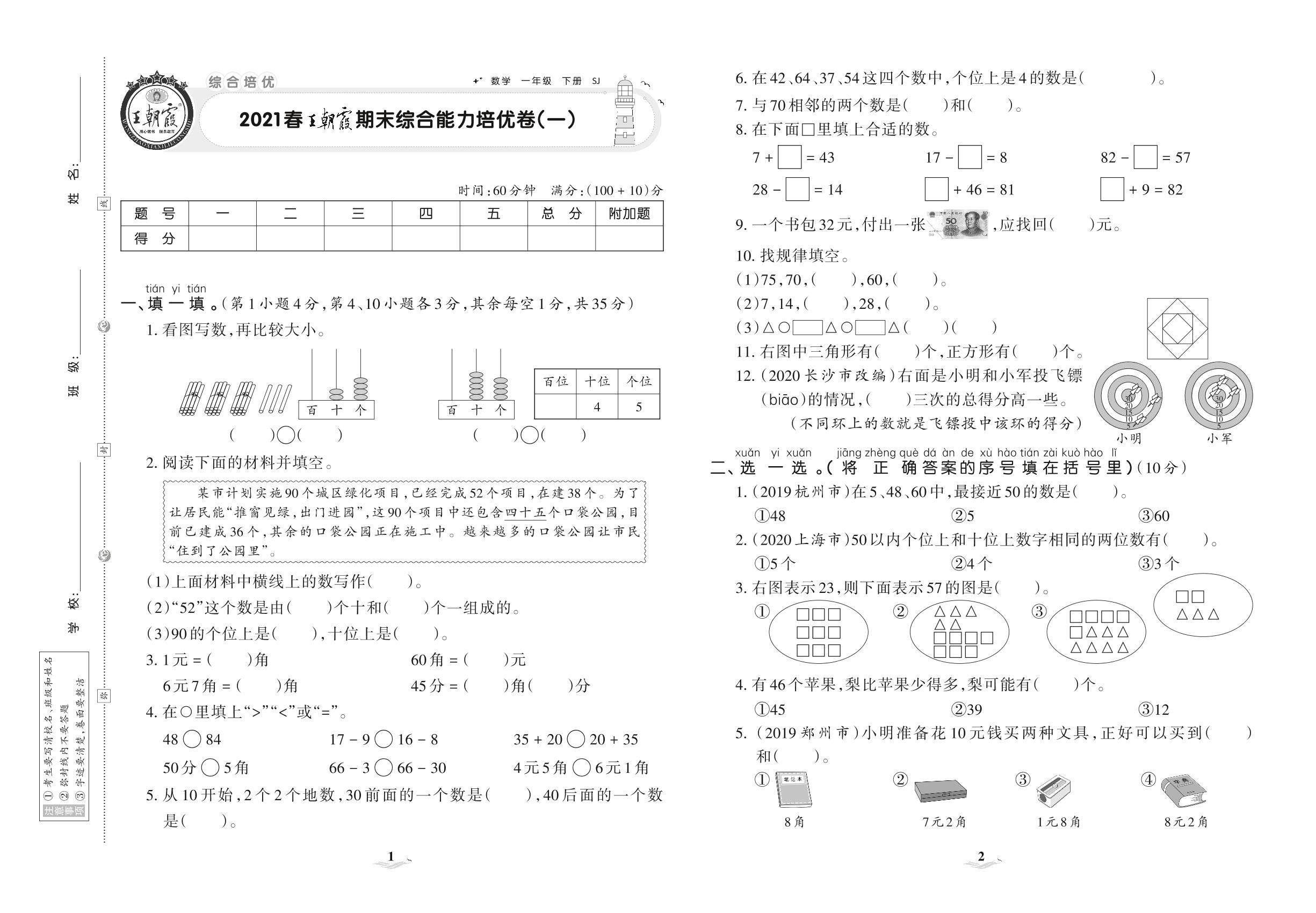 2021下册一年级数学苏教版 王朝霞期末综合能力培优卷(一)