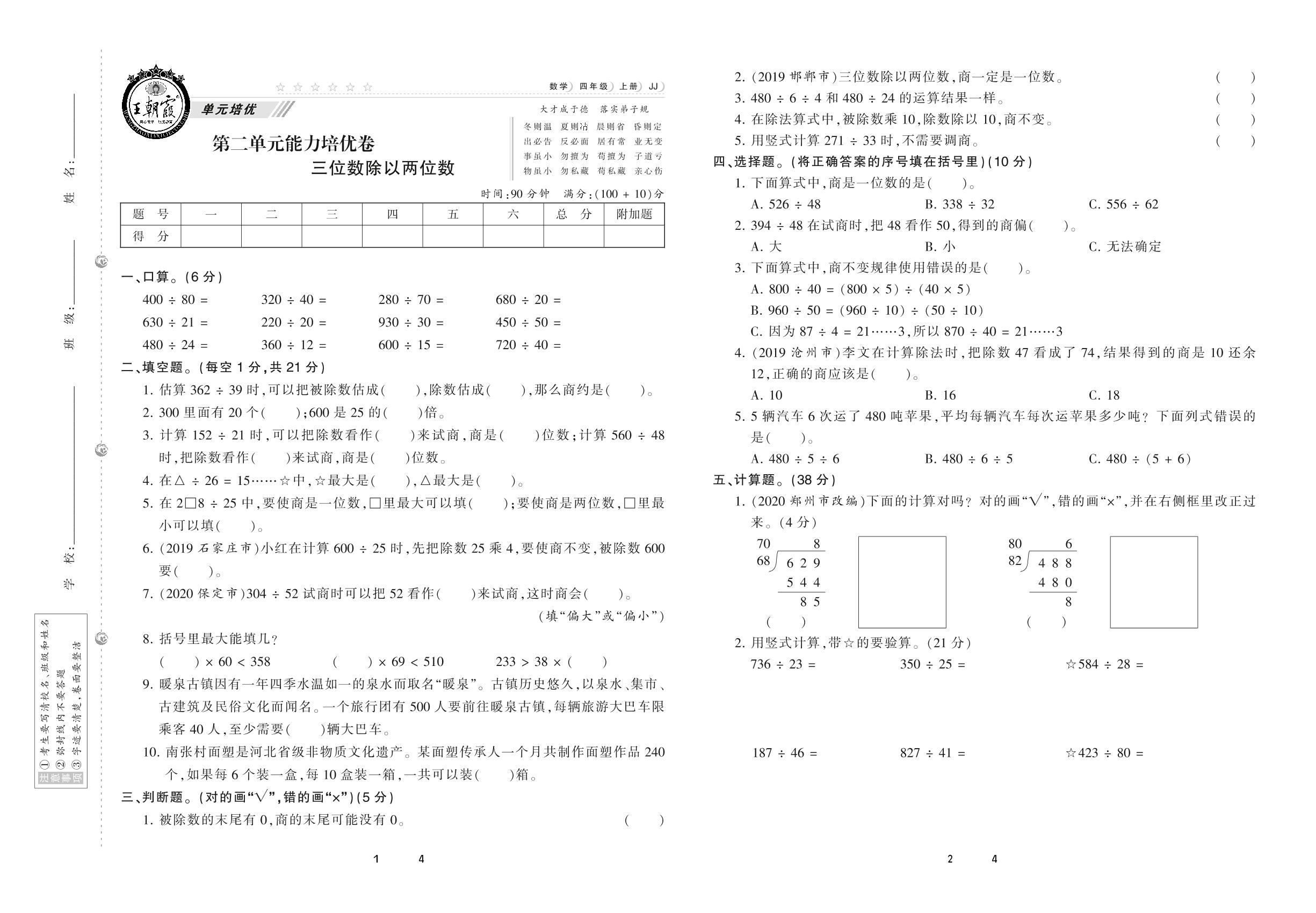 2020上册四年级数学冀教版 第二单元 能力培优卷