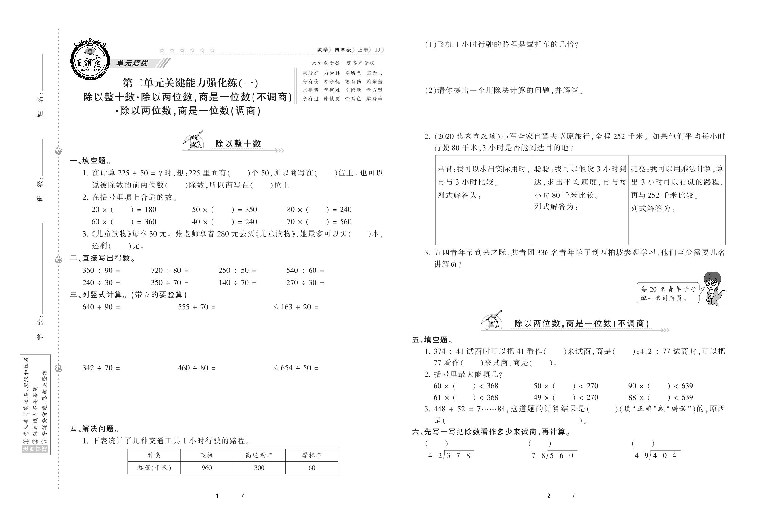 2020上册四年级数学冀教版 第二单元 关键能力强化练(一)
