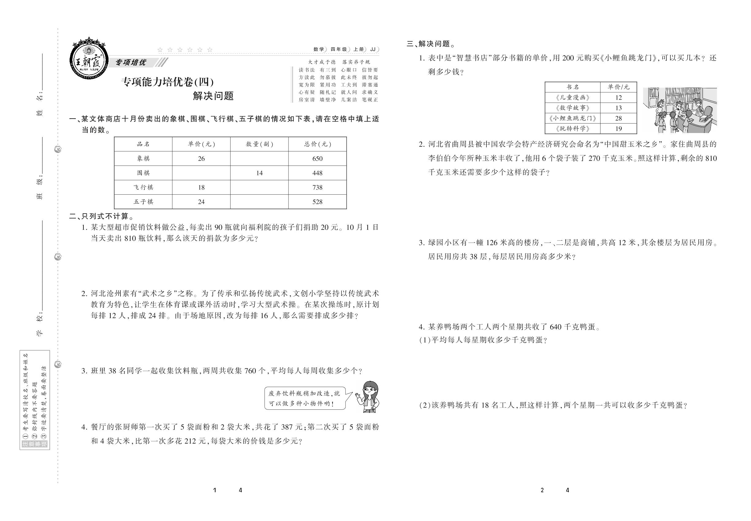 2020上册四年级数学冀教版 专项能力培优卷(四) 解决问题