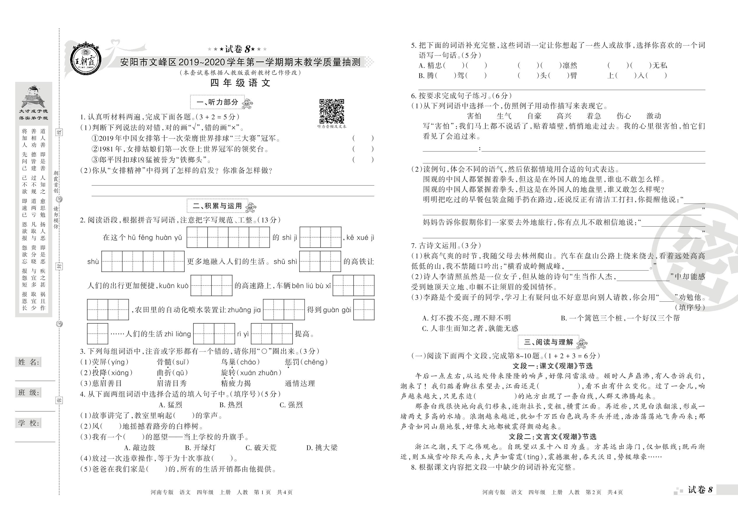 2019-2020学年第一学期安阳市文峰区四年级语文试卷(人教版)【8】