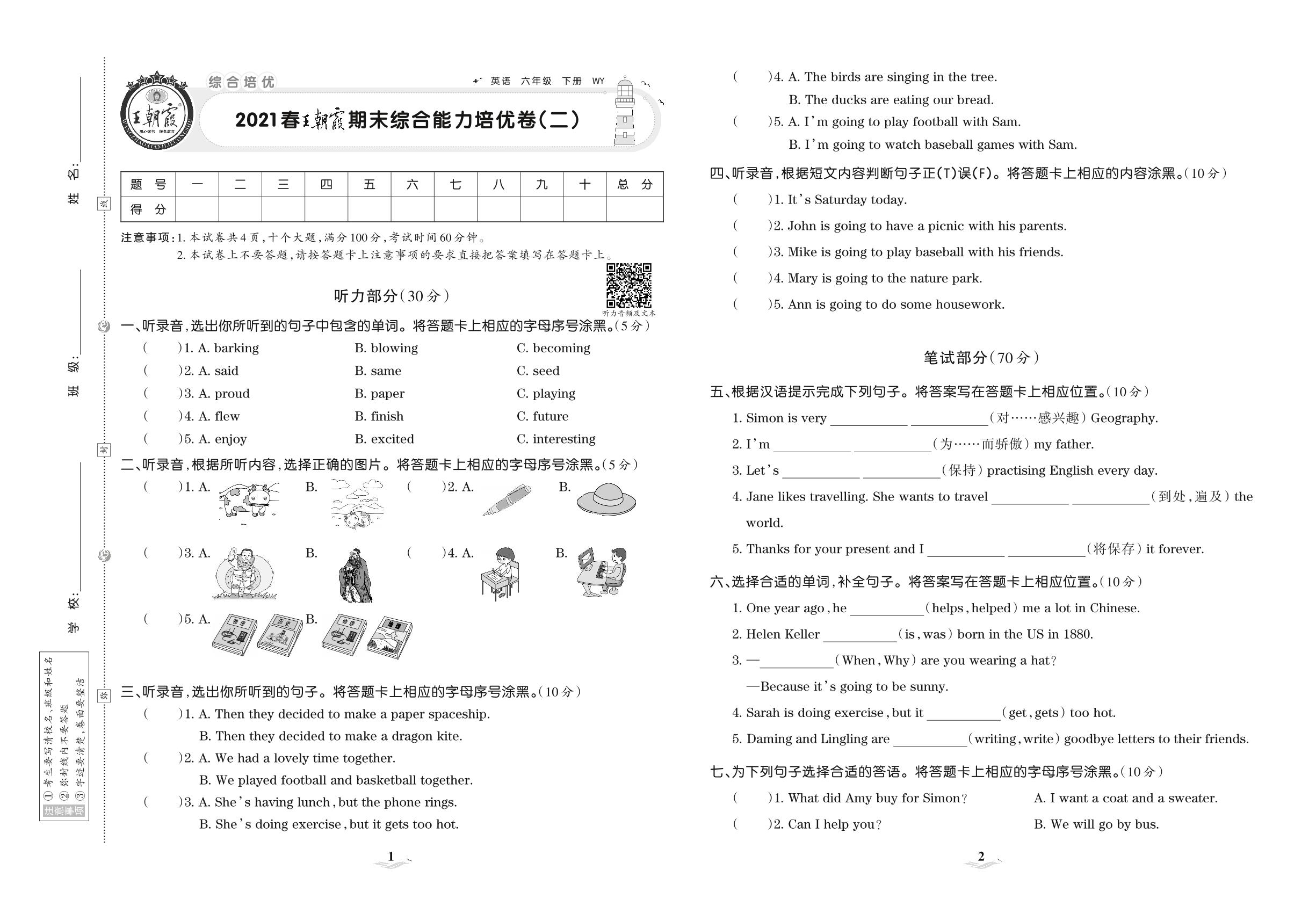 2021下册六年级英语外研版 王朝霞期末综合能力培优卷(二)