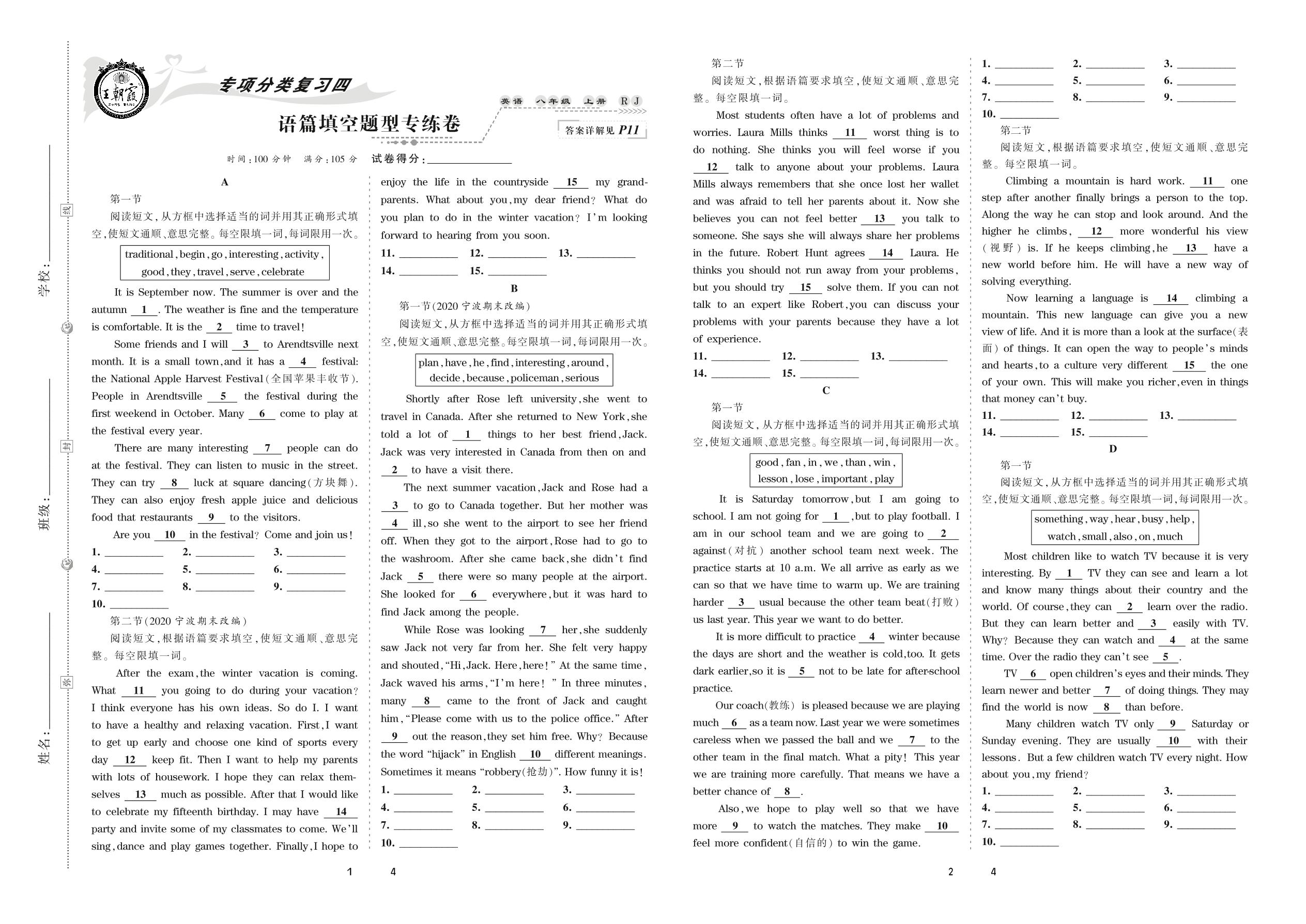2020上册八年级英语人教版 语篇填空题型专练卷