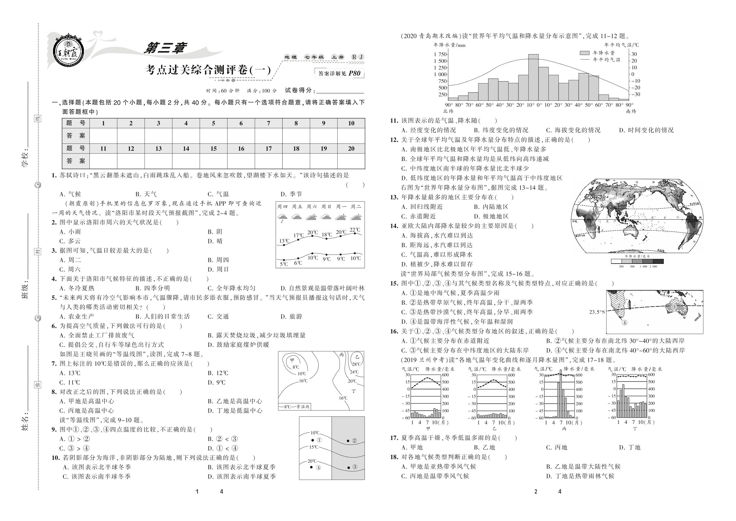 2020上册七年级地理人教版 第三章 考点过关综合测评卷(一)