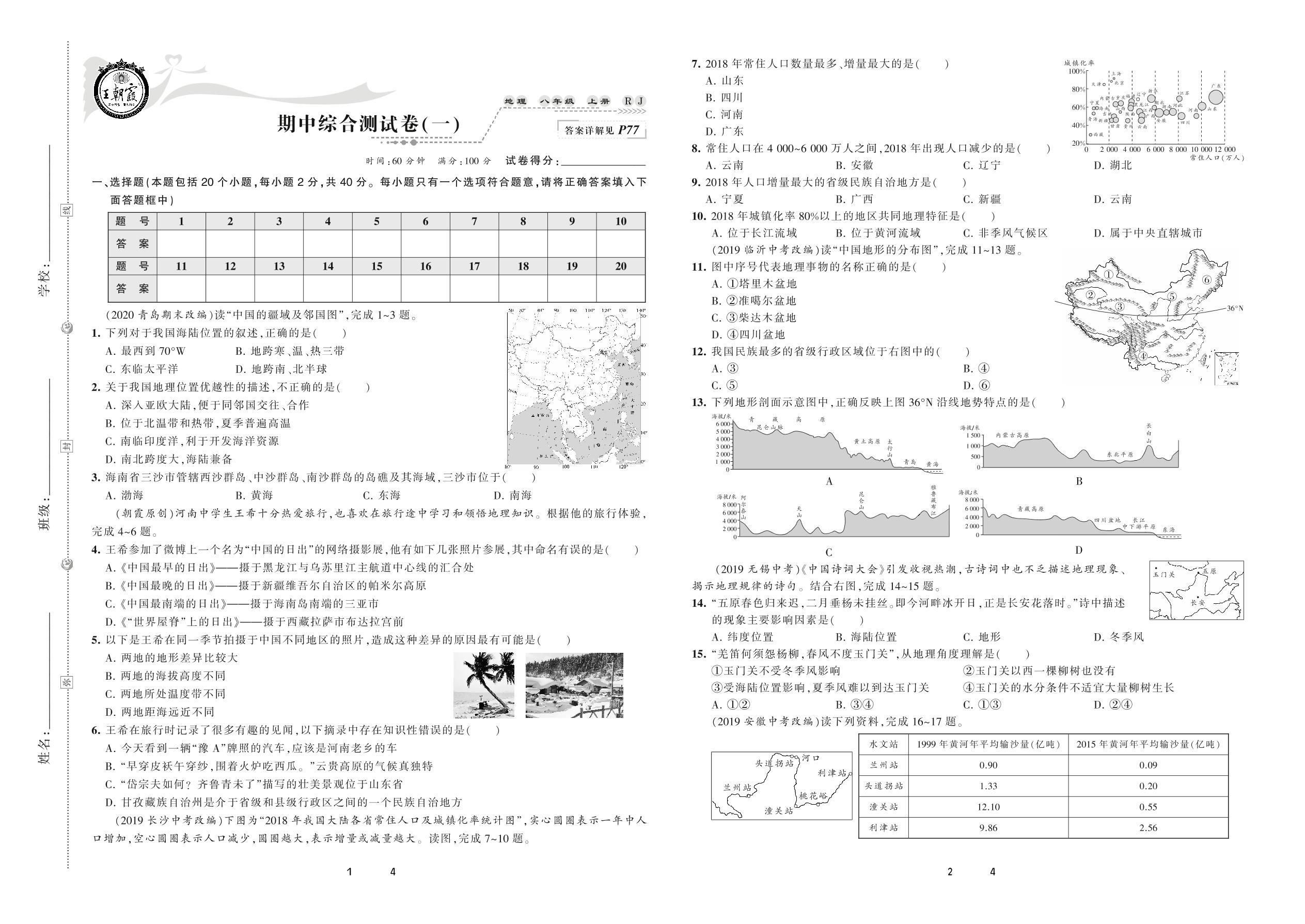 2020上册八年级地理人教版 期中综合测试卷(一)