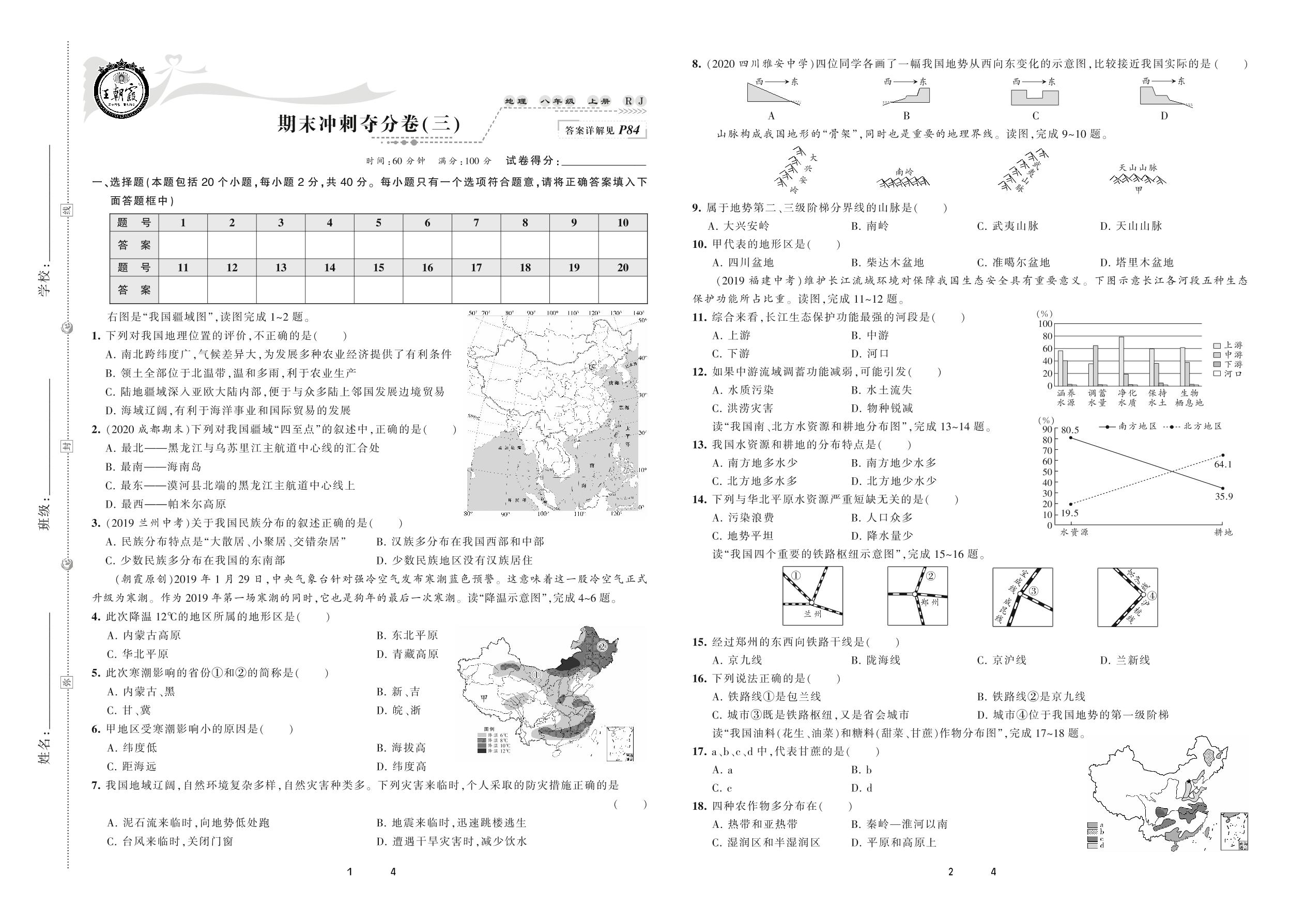 2020上册八年级地理人教版 期末冲刺夺分卷(三)