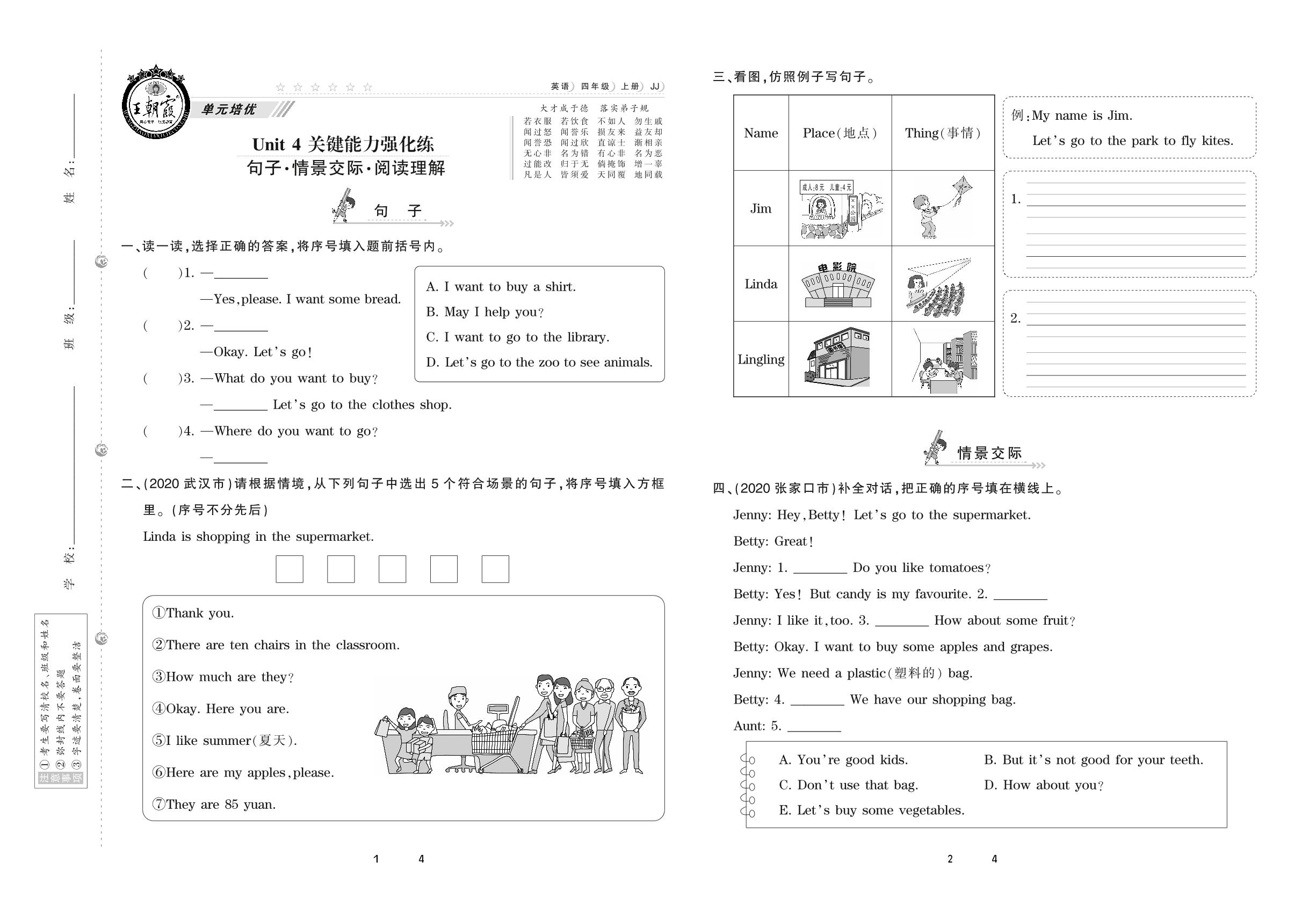 2020上册四年级英语冀教版 Unit 4 关键能力强化练