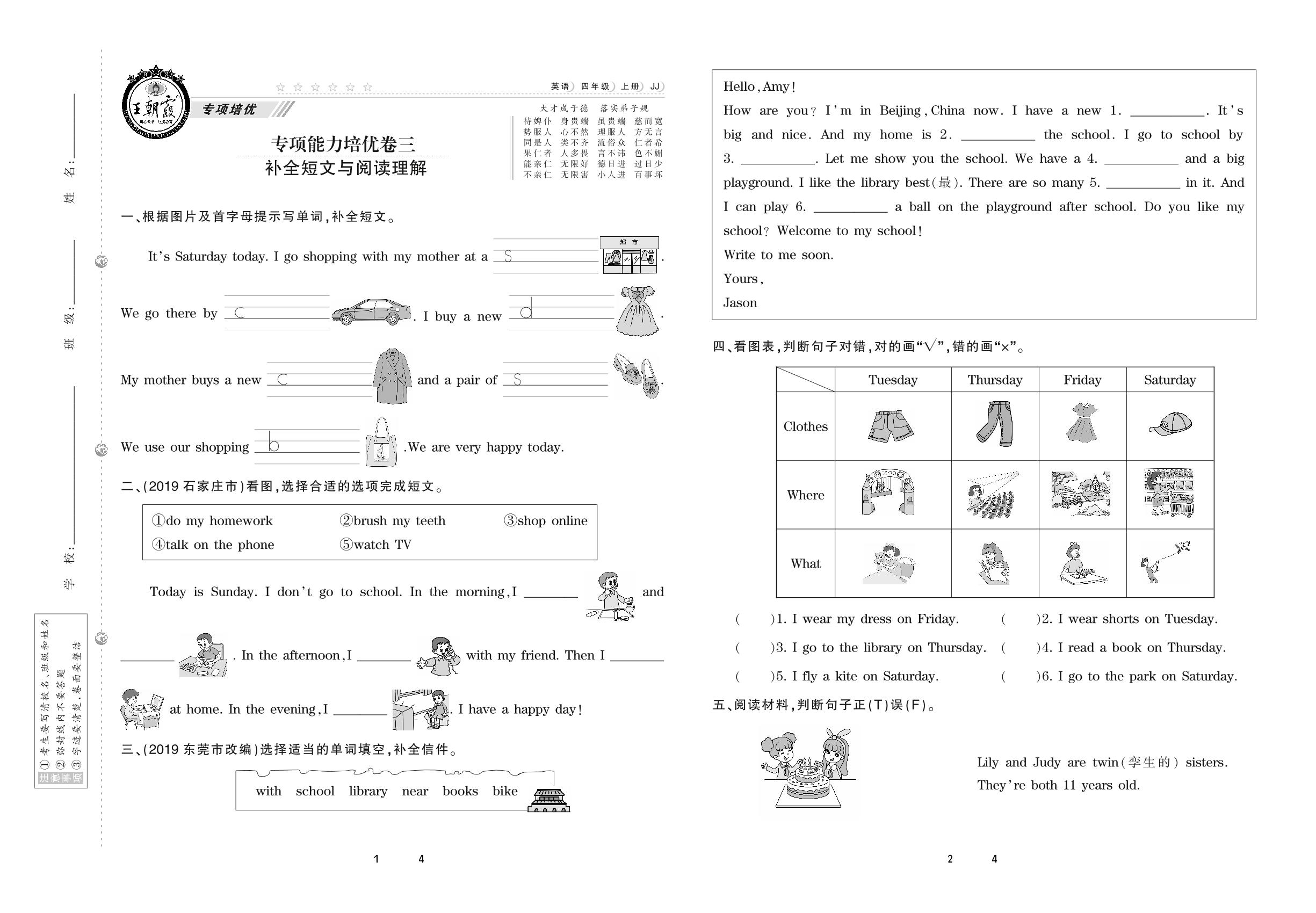 2020上册四年级英语冀教版 专项能力培优卷三 补全短文与阅读理解