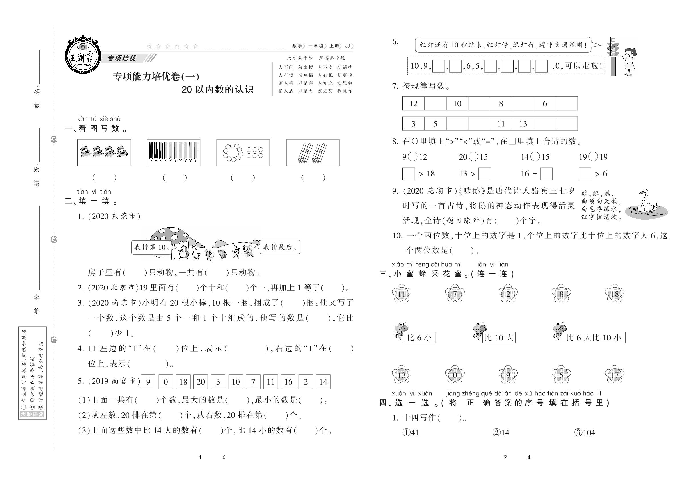 2020上册一年级数学冀教版 专项能力培优卷(一) 20以内数的认识