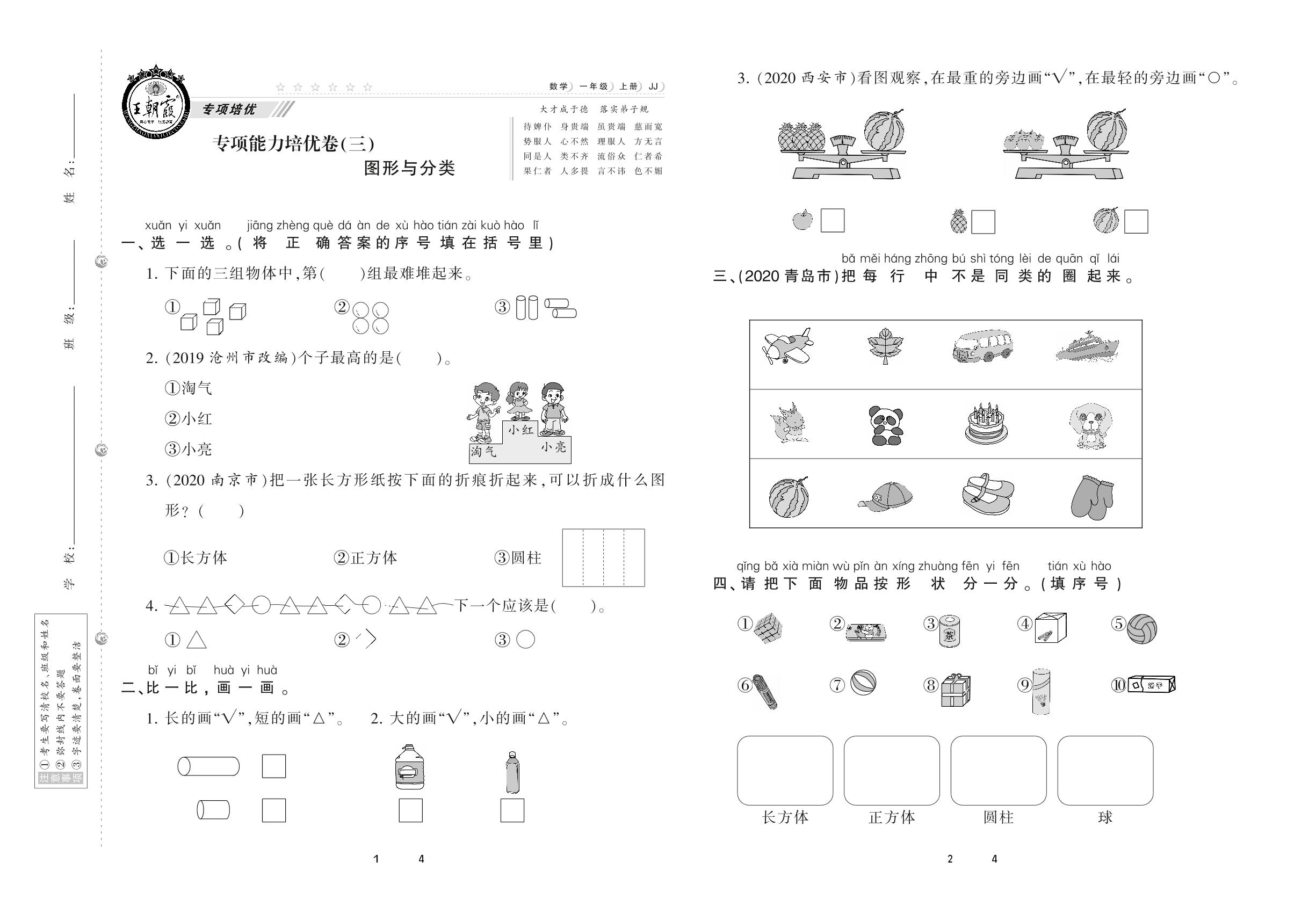 2020上册一年级数学冀教版 专项能力培优卷(三) 图形与分类