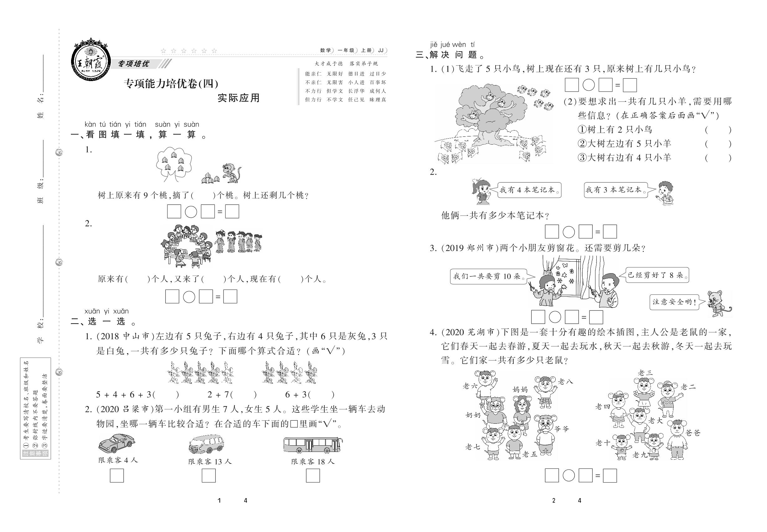 2020上册一年级数学冀教版 专项能力培优卷(四) 实际应用
