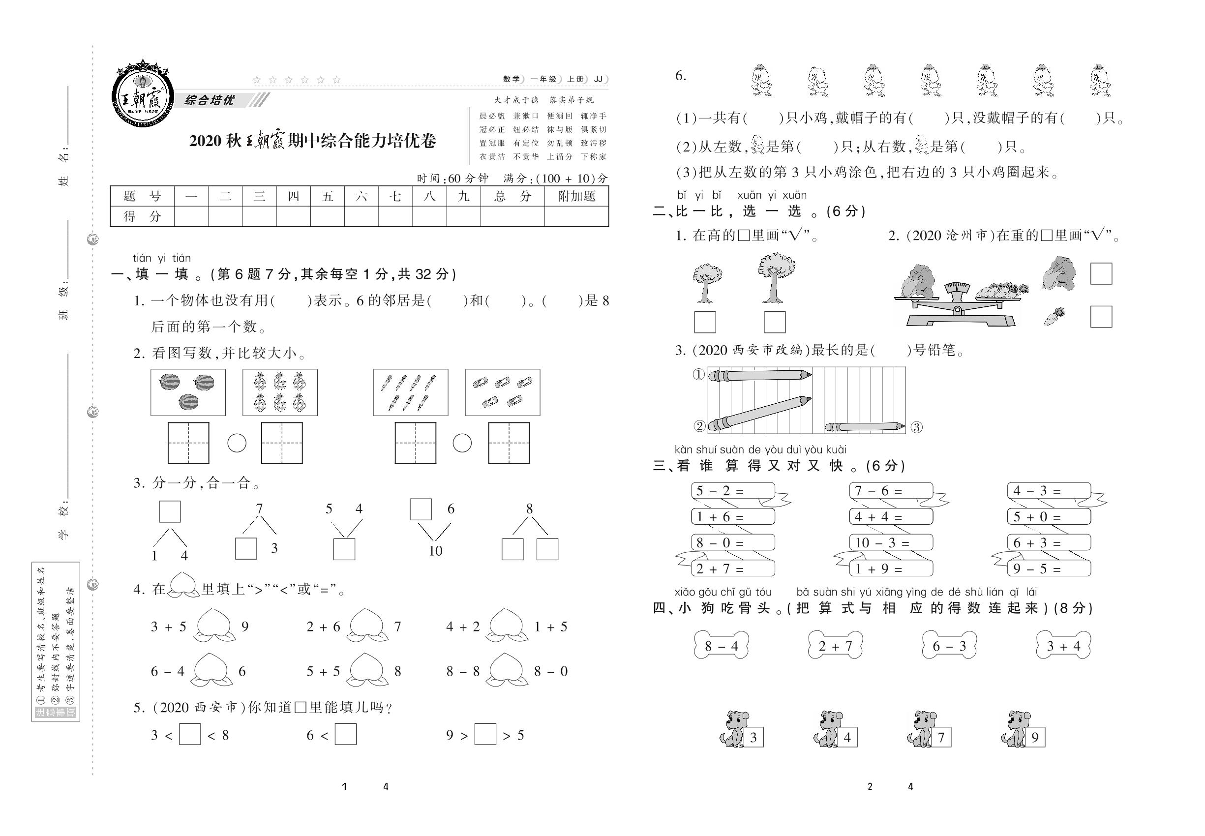 2020上册一年级数学冀教版 王朝霞期中综合能力培优卷