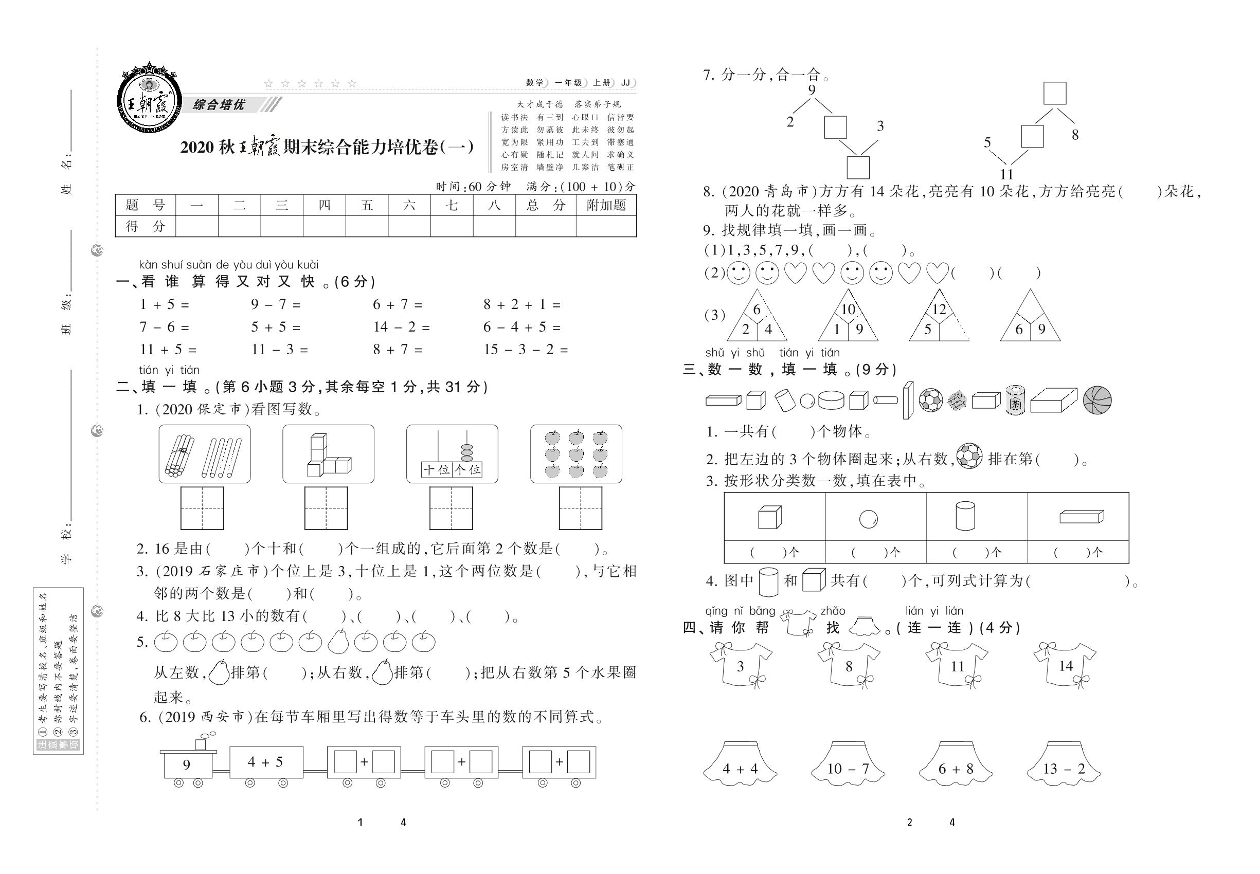 2020上册一年级数学冀教版 王朝霞期末综合能力培优卷(一)
