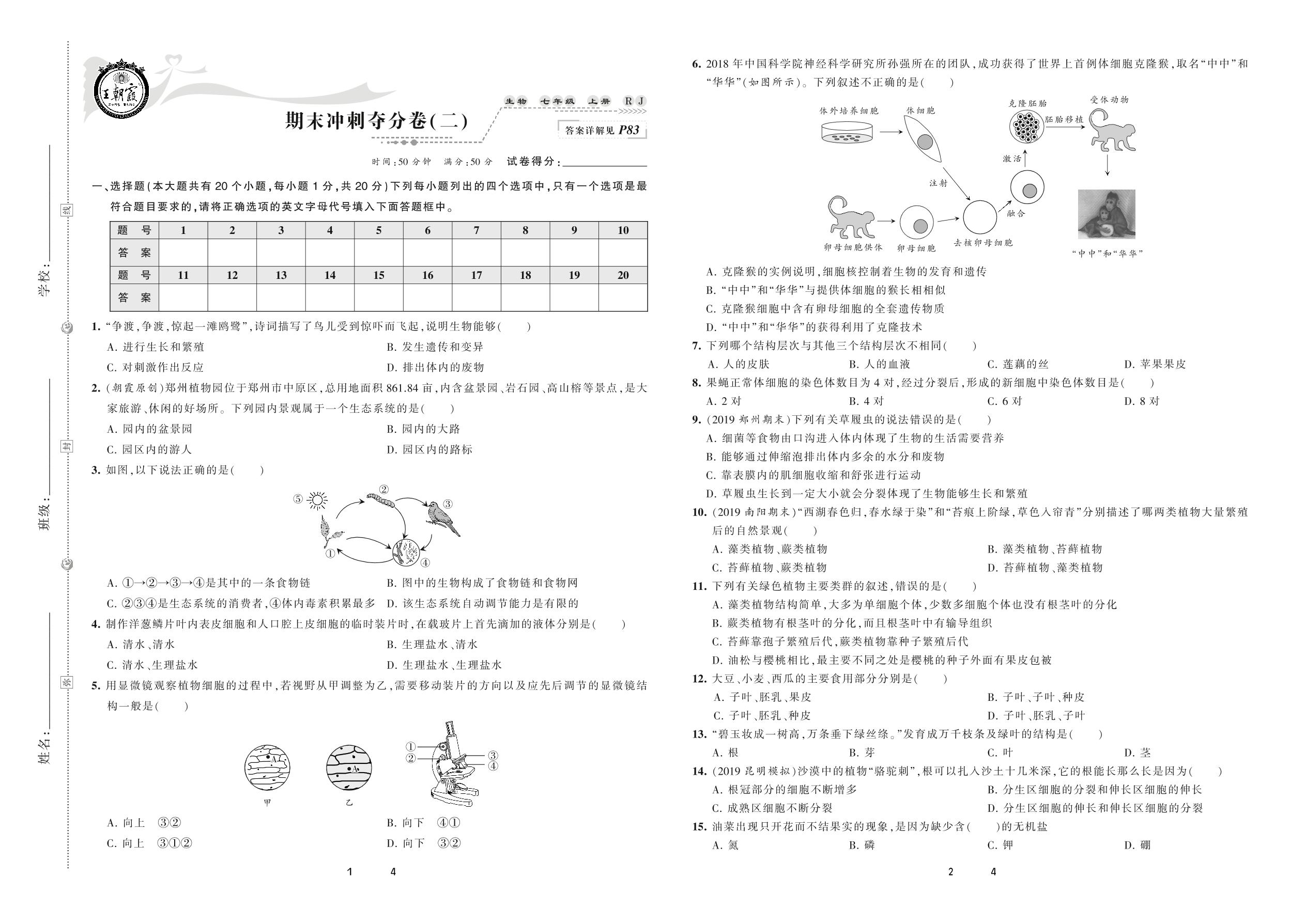 2020上册七年级生物人教版 期末冲刺夺分卷(二)