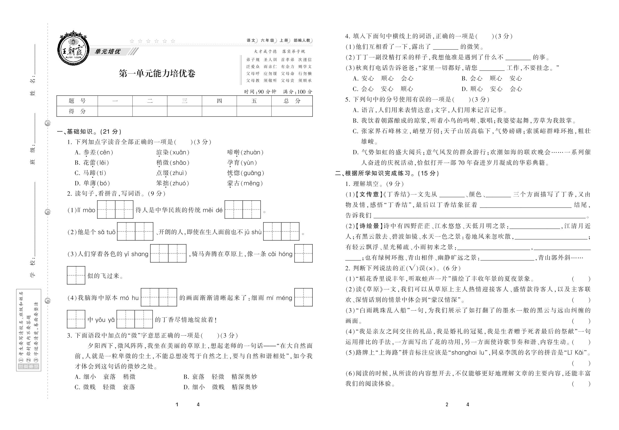 2020上册六年级语文人教版 第一单元 能力培优卷