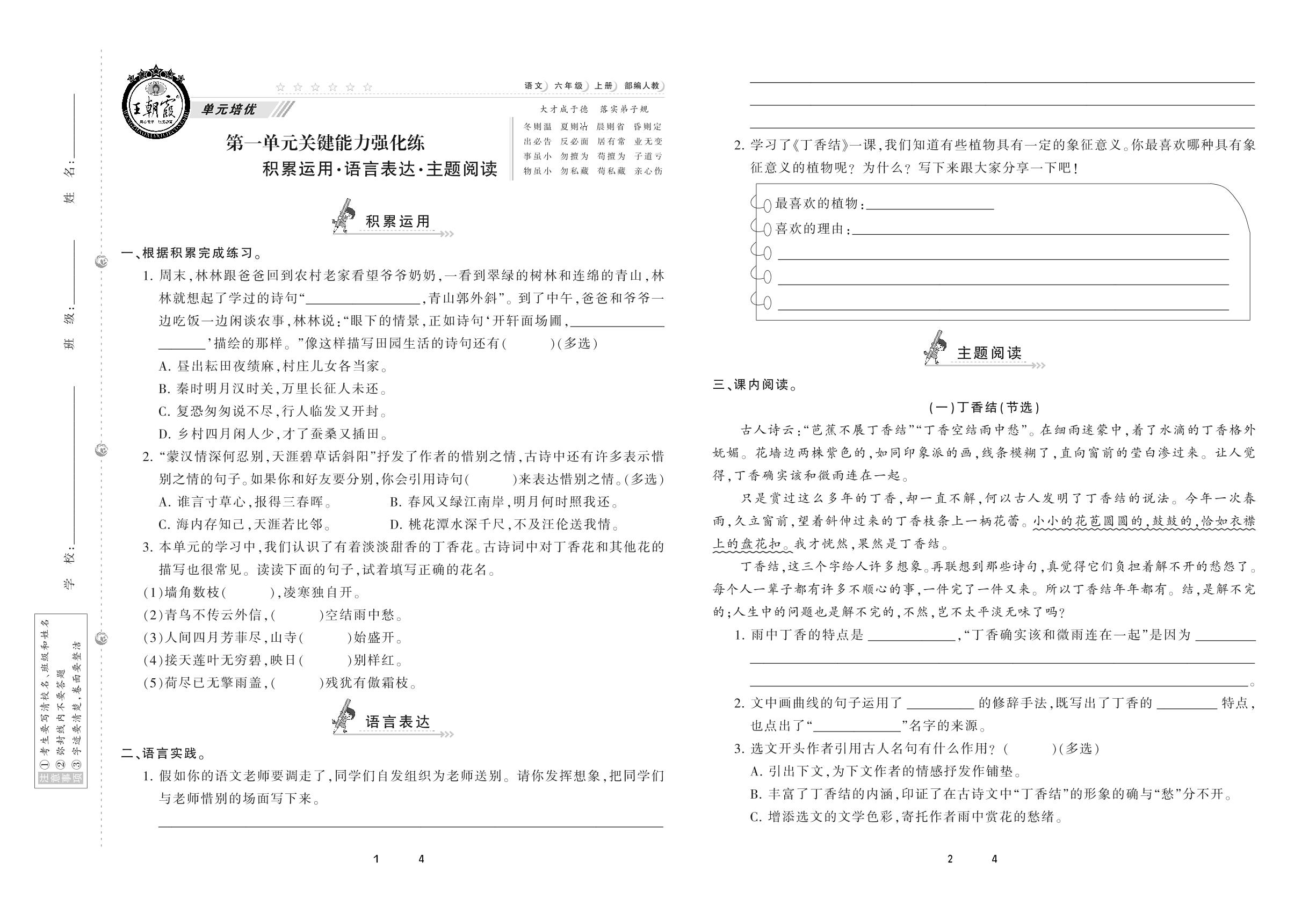 2020上册六年级语文人教版 第一单元 关键能力强化练