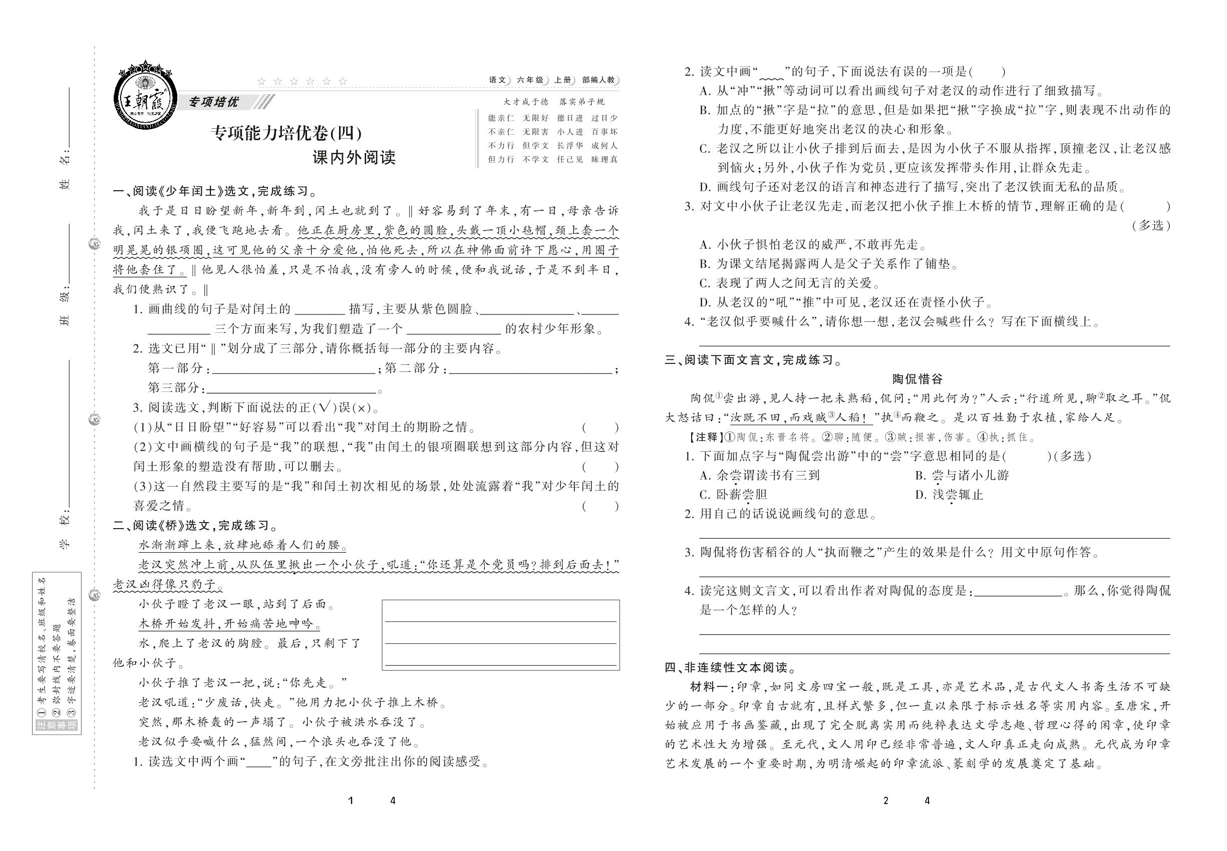 2020上册六年级语文人教版 专项能力培优卷(四) 课内外阅读