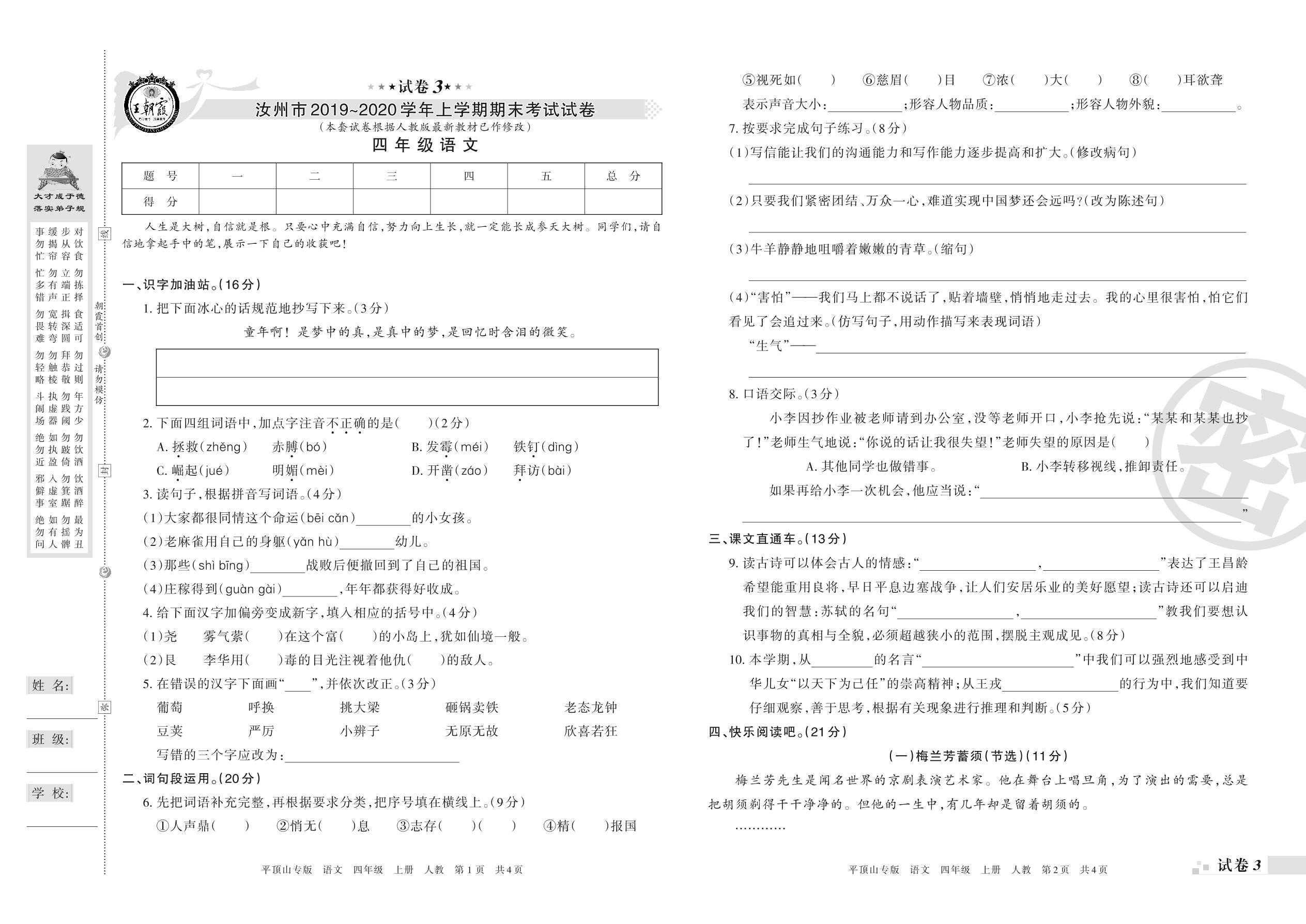 2019-2020学年第一学期汝州市四年级语文试卷(人教版)【3】