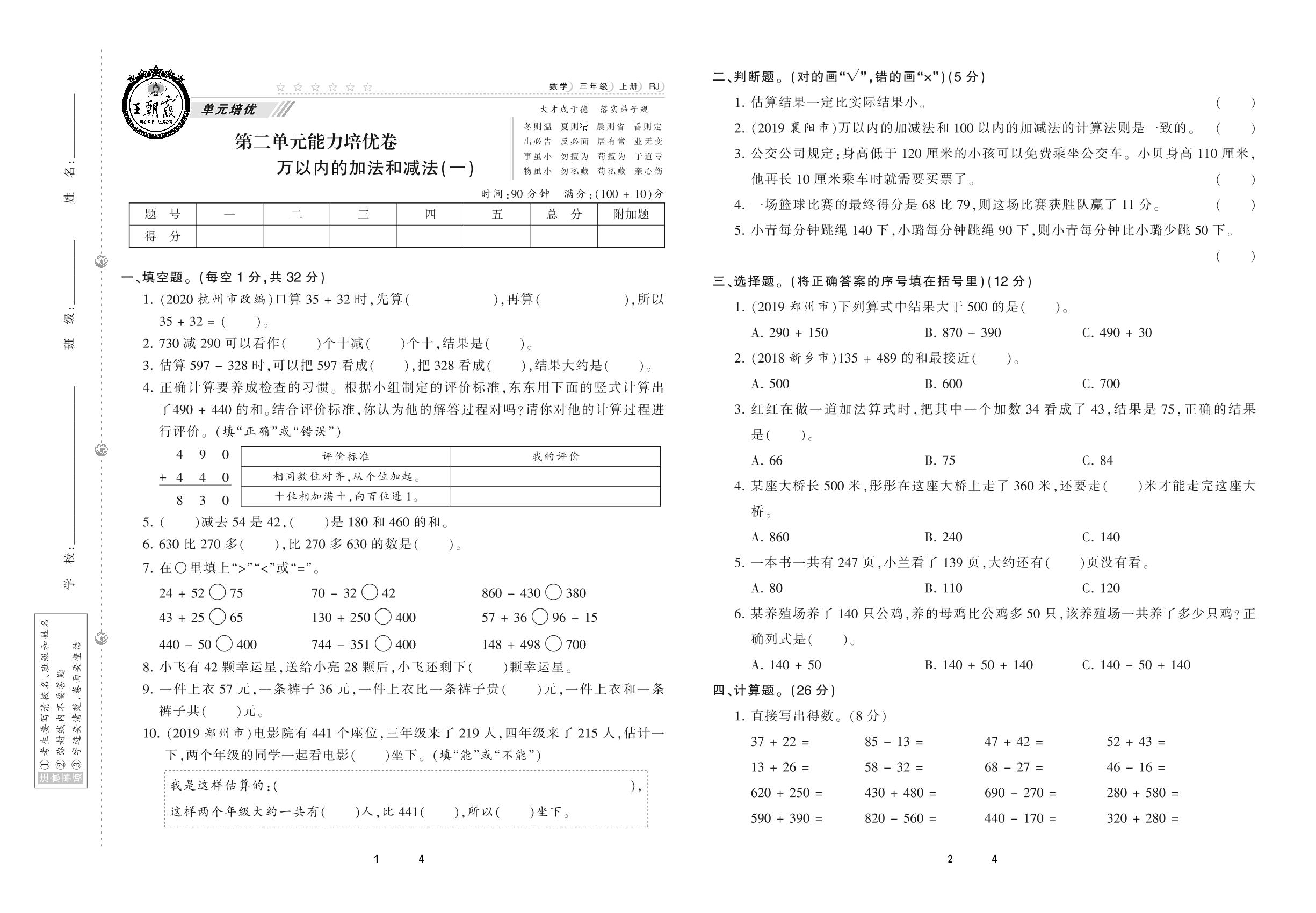 2020上册三年级数学人教版 第二单元 能力培优卷