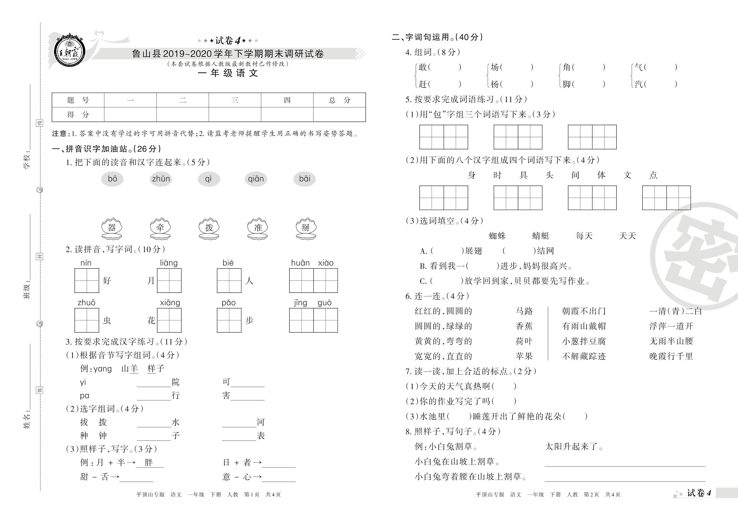 2019-2020学年第二学期平顶山市鲁山县一年级语文试卷(人教版)【4】