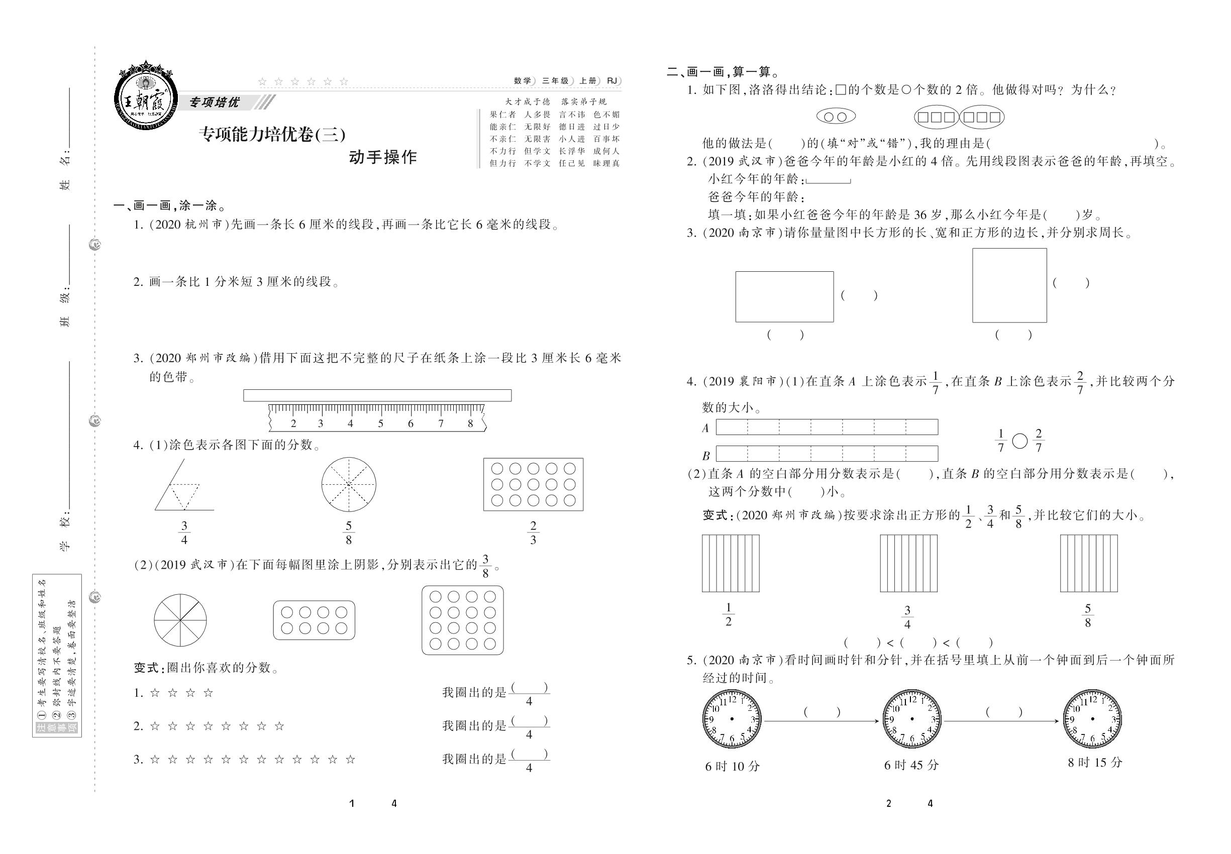 2020上册三年级数学人教版 专项能力培优卷(三) 动手操作