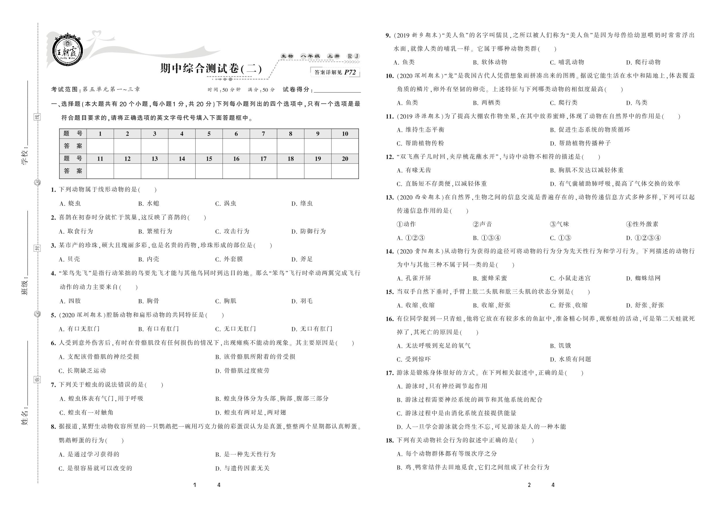 2020上册八年级生物人教版 期中综合测试卷(二)